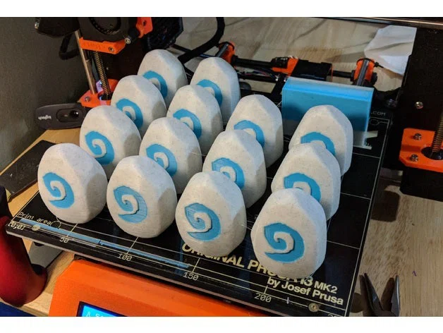 Mẫu Hearthstone (Multi-Material) để in trên Prusa MMU. Ai cũng cần một viên Hearthstone. Gợi ý filament kiểu đá và filament xanh teal, kèm thiết lập in: 0% infll, 3–4 shell.