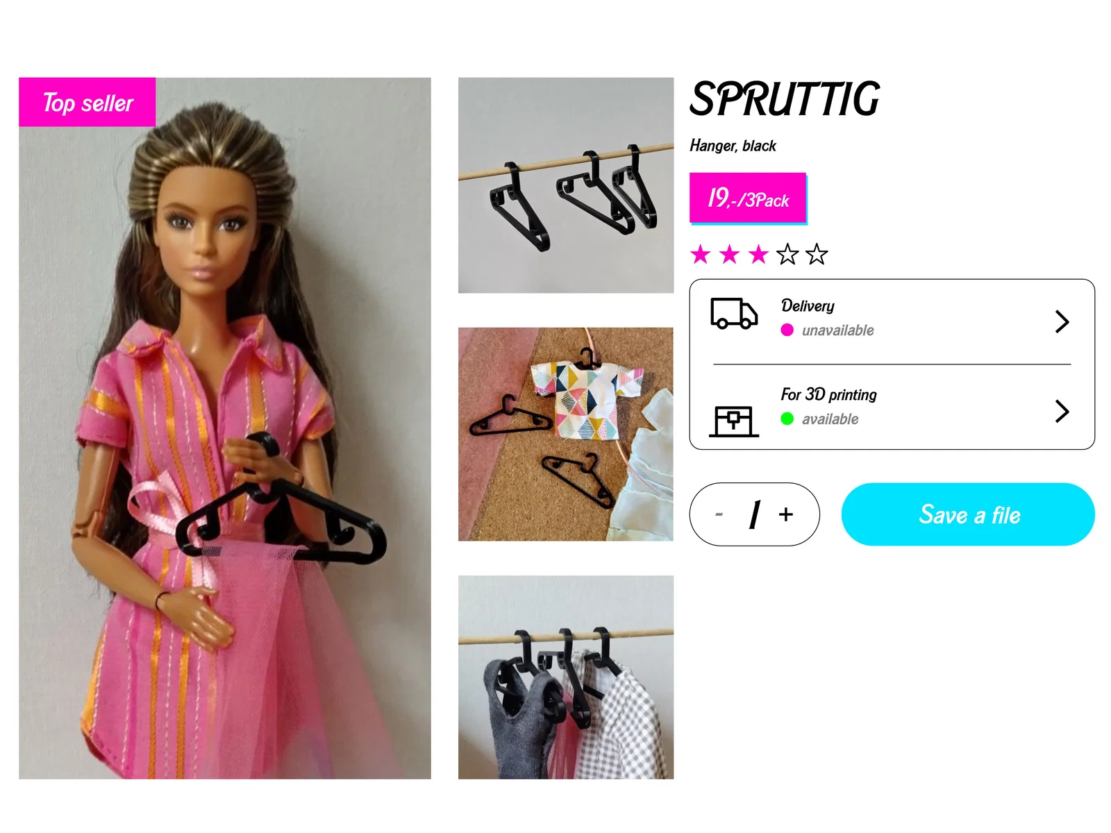 Móc áo Spruttig cỡ búp bê tỉ lệ 1:6, lấy cảm hứng từ IKEA Spruttig. In PLA, layer height 0.2 mm, không cần supports. Dùng treo đồ cho búp bê hoặc làm móc treo trang sức; tương thích với giá treo quần áo đi kèm.
