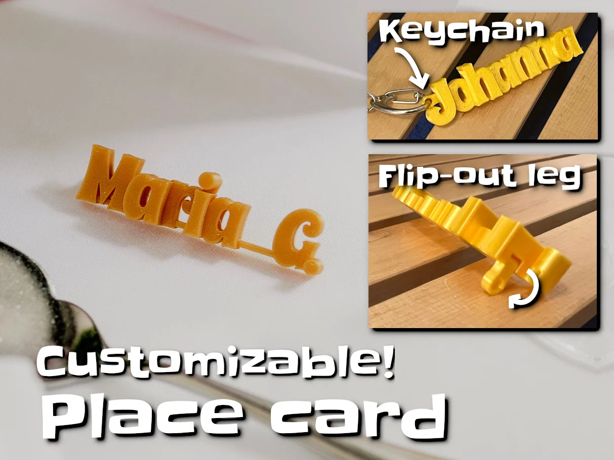 Bảng tên để bàn cho các buổi lễ trang trọng như đám cưới, có chân đỡ bản lề để dựng nghiêng. Phần cuối có lỗ treo nên dùng luôn như mặt treo móc khóa. Tùy biến danh sách tên bằng OpenSCAD, xuất chung một file STL để in hàng loạt.