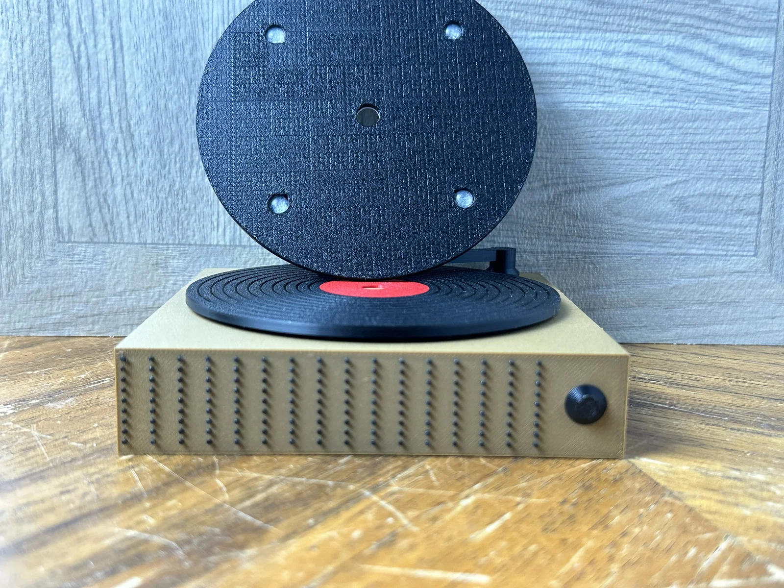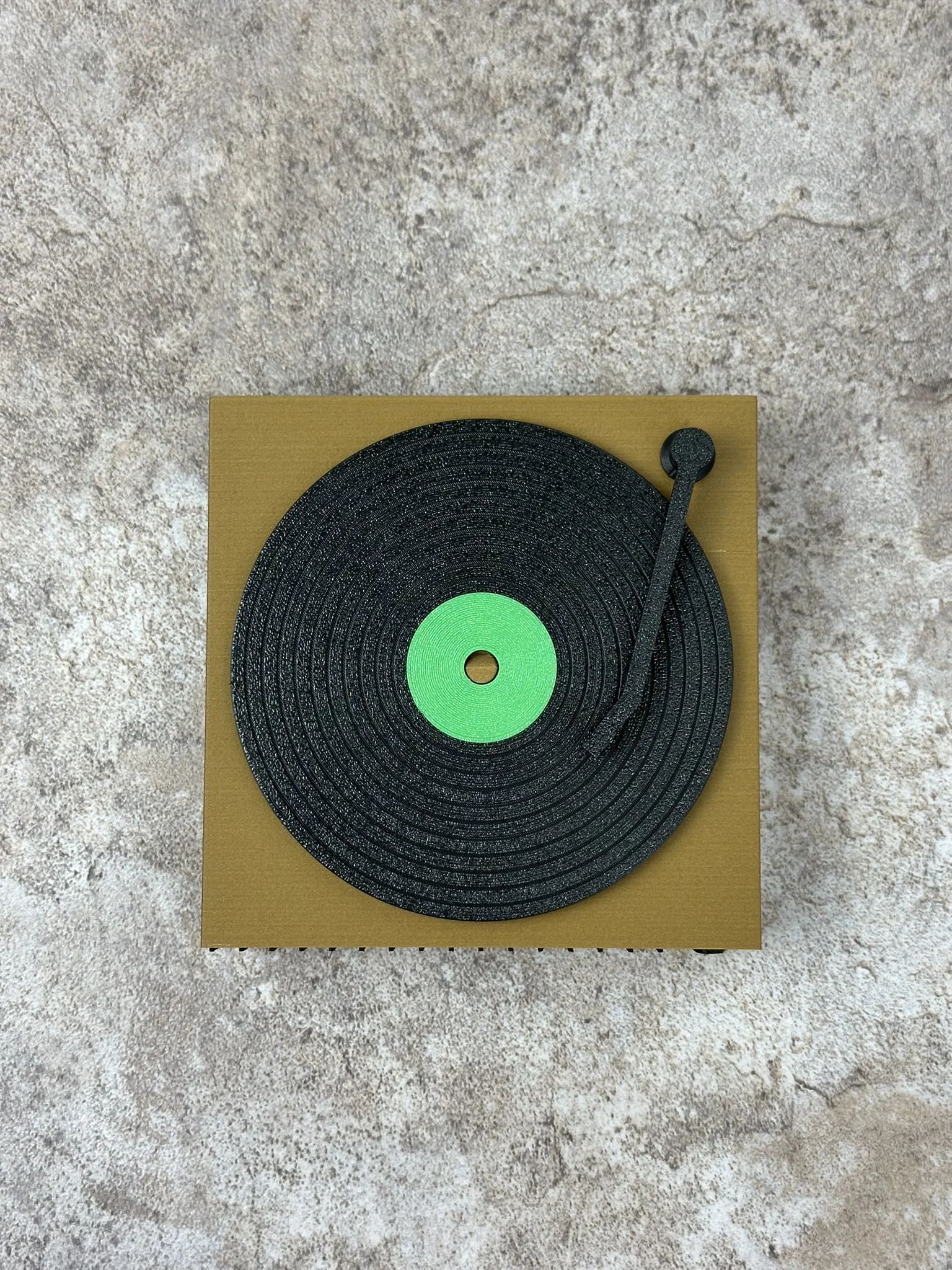 Bộ đế lót ly hình đĩa vinyl kèm kệ trưng bày, kiểu decor gọn gàng, vintage. File 3MF đã set sẵn hướng in, có thêm STEP để chỉnh sửa; stylus dùng nam châm neodymium 5x2mm và có thể gắn chân silicone chống trượt.