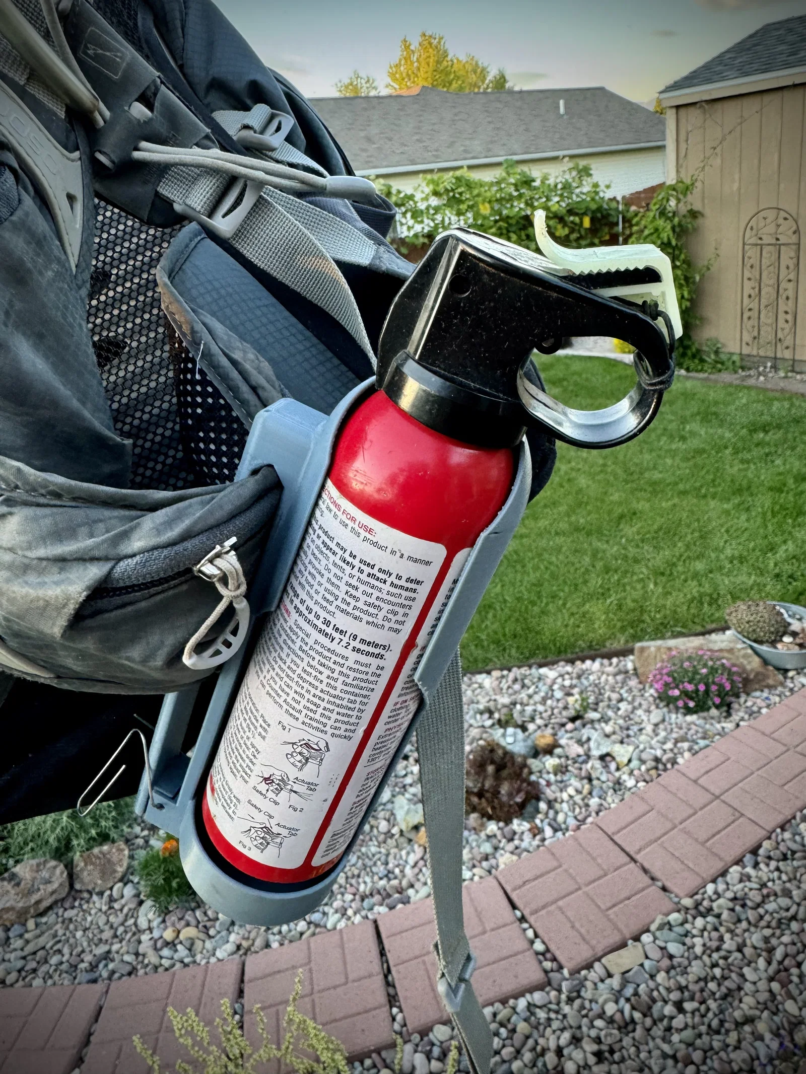 Mình không thích mấy bình bear spray kiểu treo lủng lẳng, vướng víu hoặc khó với tới. Cái holster rút nhanh này kẹp lên dây belt của balo để rút ra dùng nhanh và dễ. Mình thấy đeo kiểu crossbody sẽ tiện hơn, nên mình đi tay phải thì gắn holster ở bên trái dây belt của balo. Mình có làm sẵn cả bản trái và bản phải.