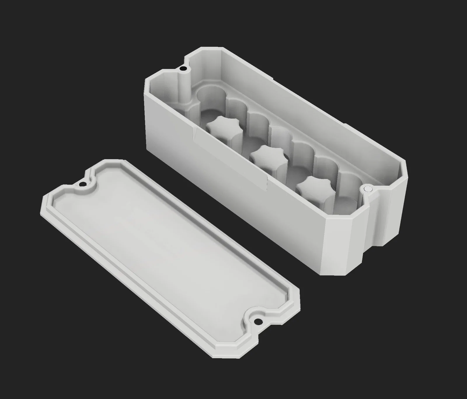 Mình tạo một cái hộp đơn giản để chứa các lọ (vial) 3ml và 10ml theo kiểu sắp xếp dày, tiết kiệm diện tích. Thay vì làm nắp có bản lề dễ gãy, mình chọn dùng nam châm đĩa 6x3, 4 viên cho mỗi hộp, lắp kiểu ép chặt (friction-fit) và có hỗ trợ bằng keo super glue.