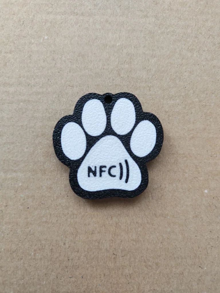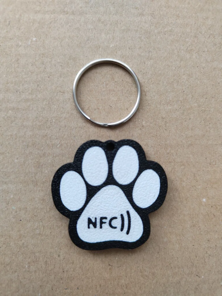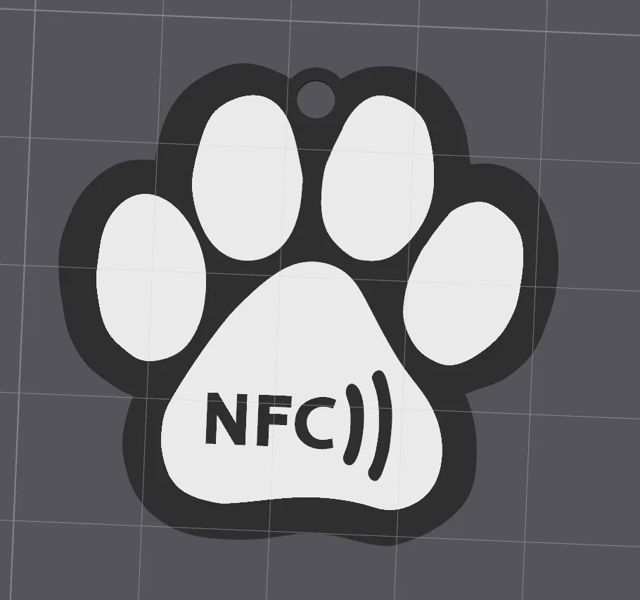 Mẫu móc khóa NFC hình bàn chân chó, có khoang vừa thẻ NFC tự dính 25mm (đặt ở layer thứ 13). Phù hợp in bằng PLA, ví dụ Bambu PLA Black/White, tiện làm phụ kiện cho thú cưng và chìa khóa.