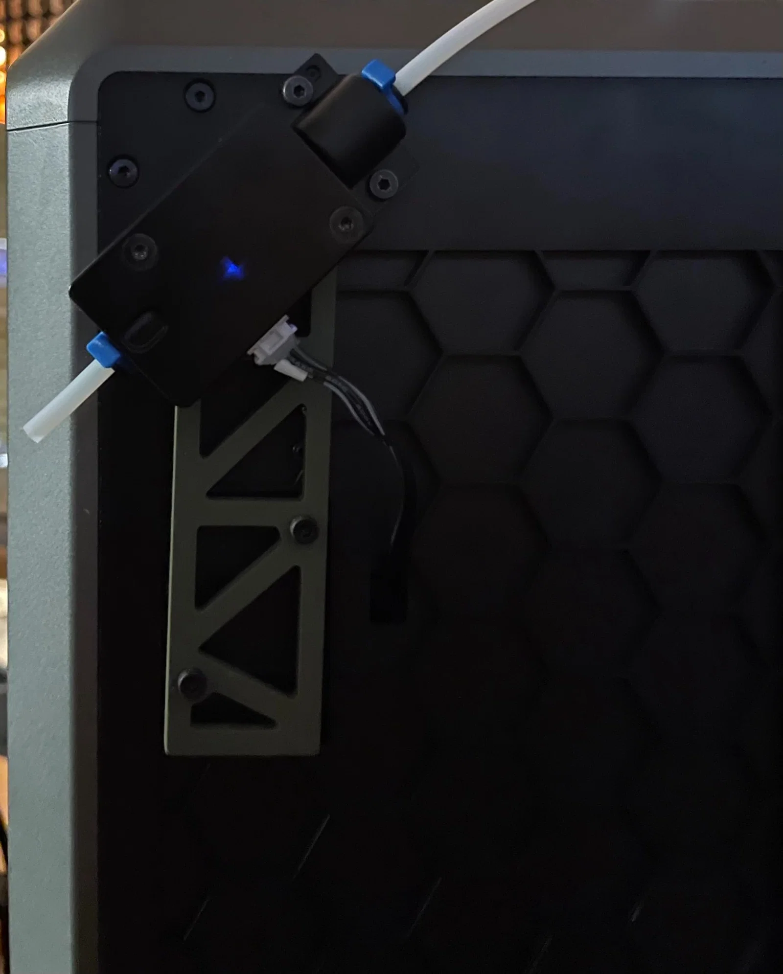 Mục đích là để nạp filament từ bên hông; trong trường hợp của mình là kéo filament từ một kệ hơi cao hơn và từ máy sấy filament, vì vị trí zin không chừa đủ khoảng hở.