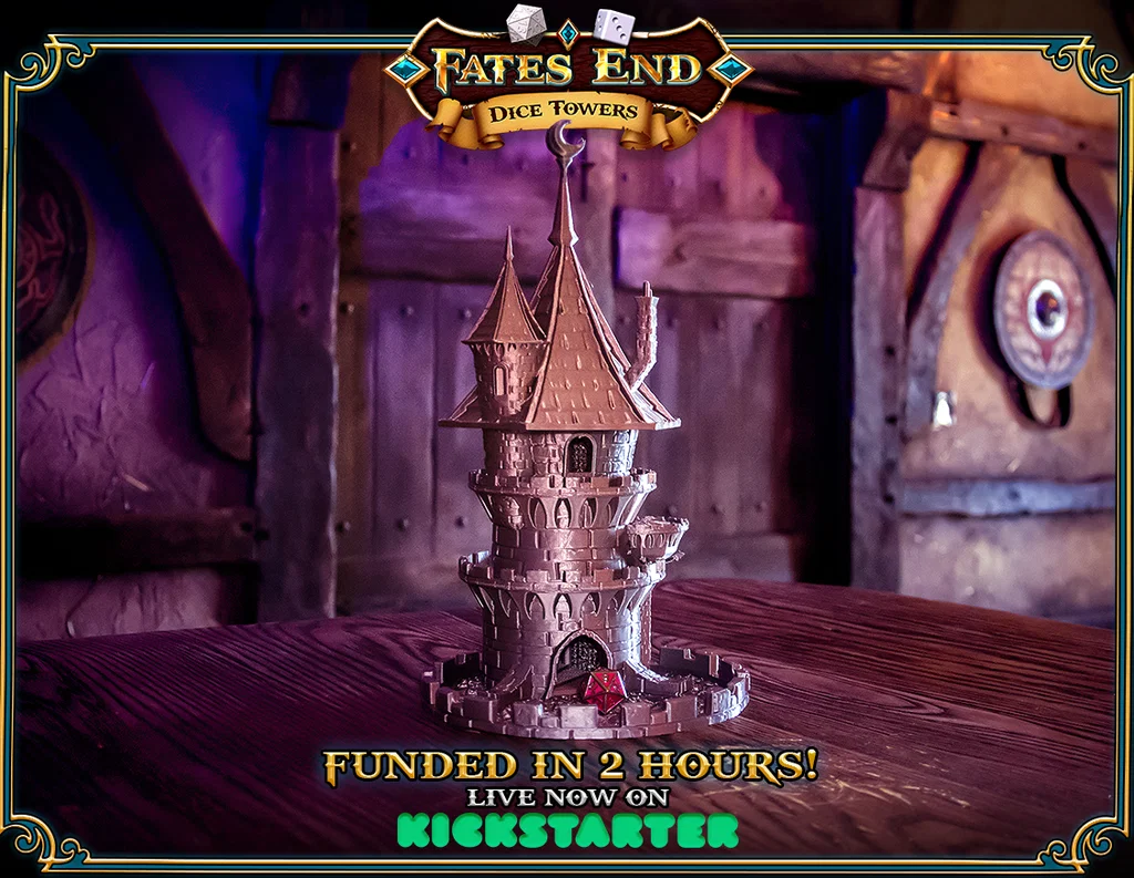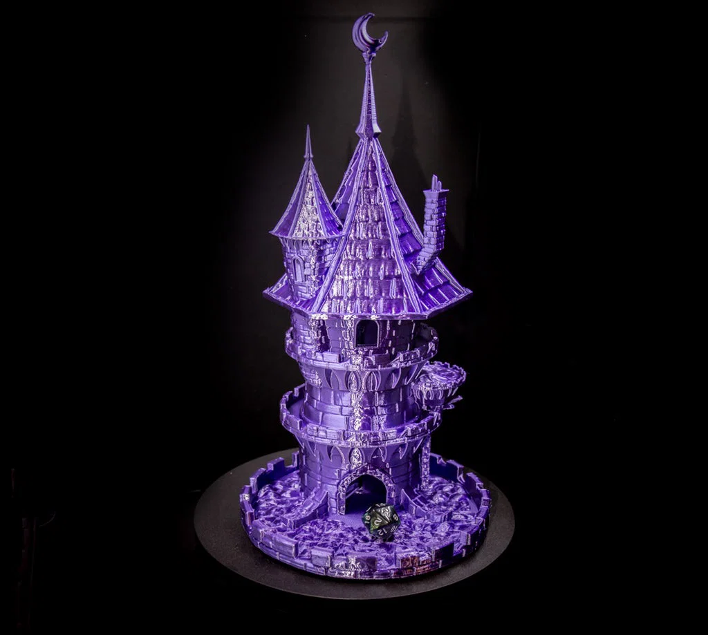 Dice tower FatesEnd dạng tháp pháp sư, thiết kế cho xúc xắc 20mm ở tỉ lệ 100%. Dễ in, không cần supports (supportless). Có nhiều cập nhật sửa peg, mái, lối ra và tuỳ chọn khay giữ xúc xắc.