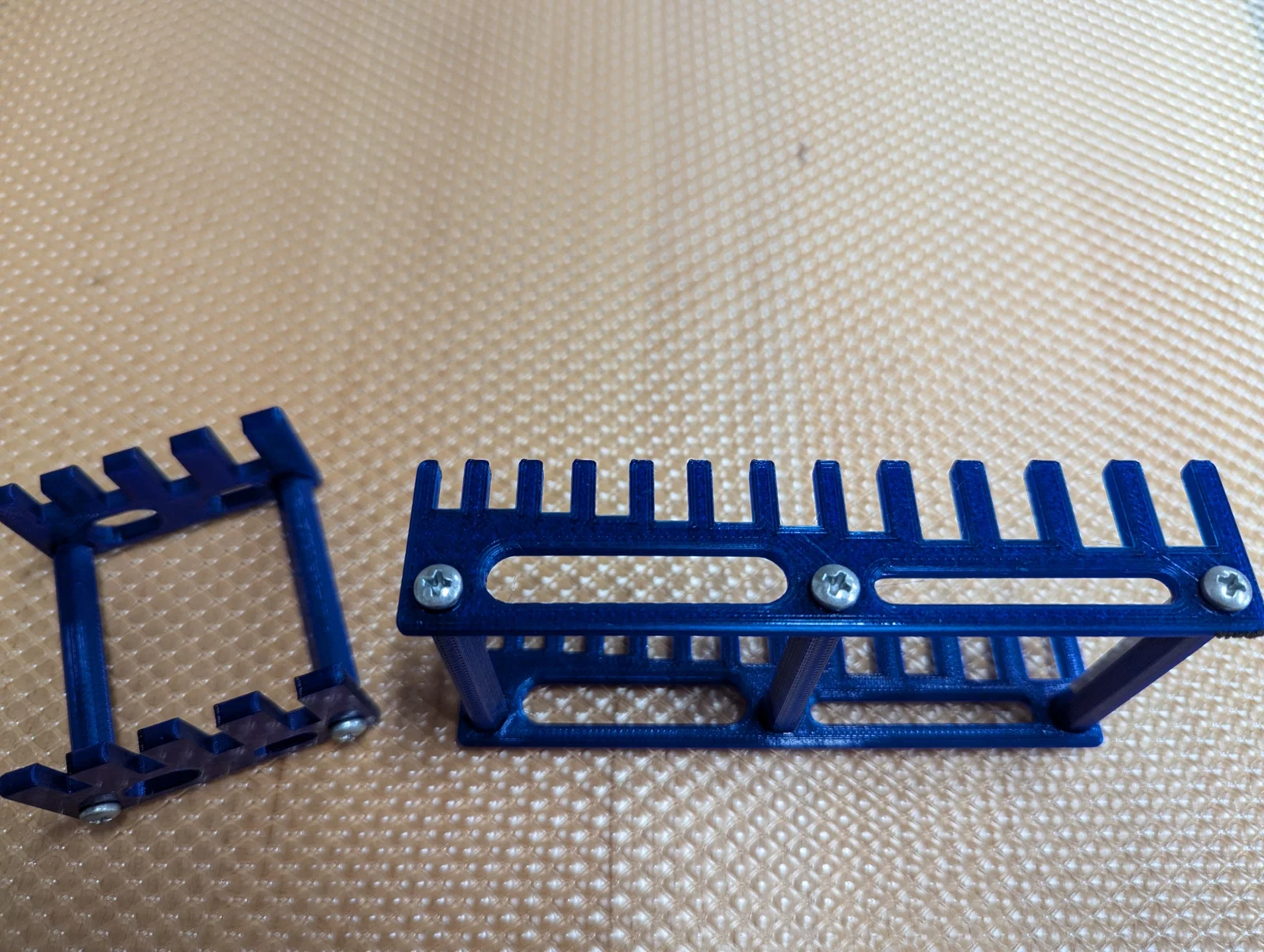 Đo mấy cây cờ-lê của bạn bằng thước kẹp (caliper), rồi nhập các số đo đó vào OpenSCAD. Mấy spacer được thiết kế theo cỡ bulông/vít M4, nhưng mình chỉ dùng đại vài con vít có sẵn ở nhà. Hướng dẫn gốc có nhắc dùng mũi taro M4, nhưng mình không gặp vấn đề gì khi để vít tự cắt ren luôn.