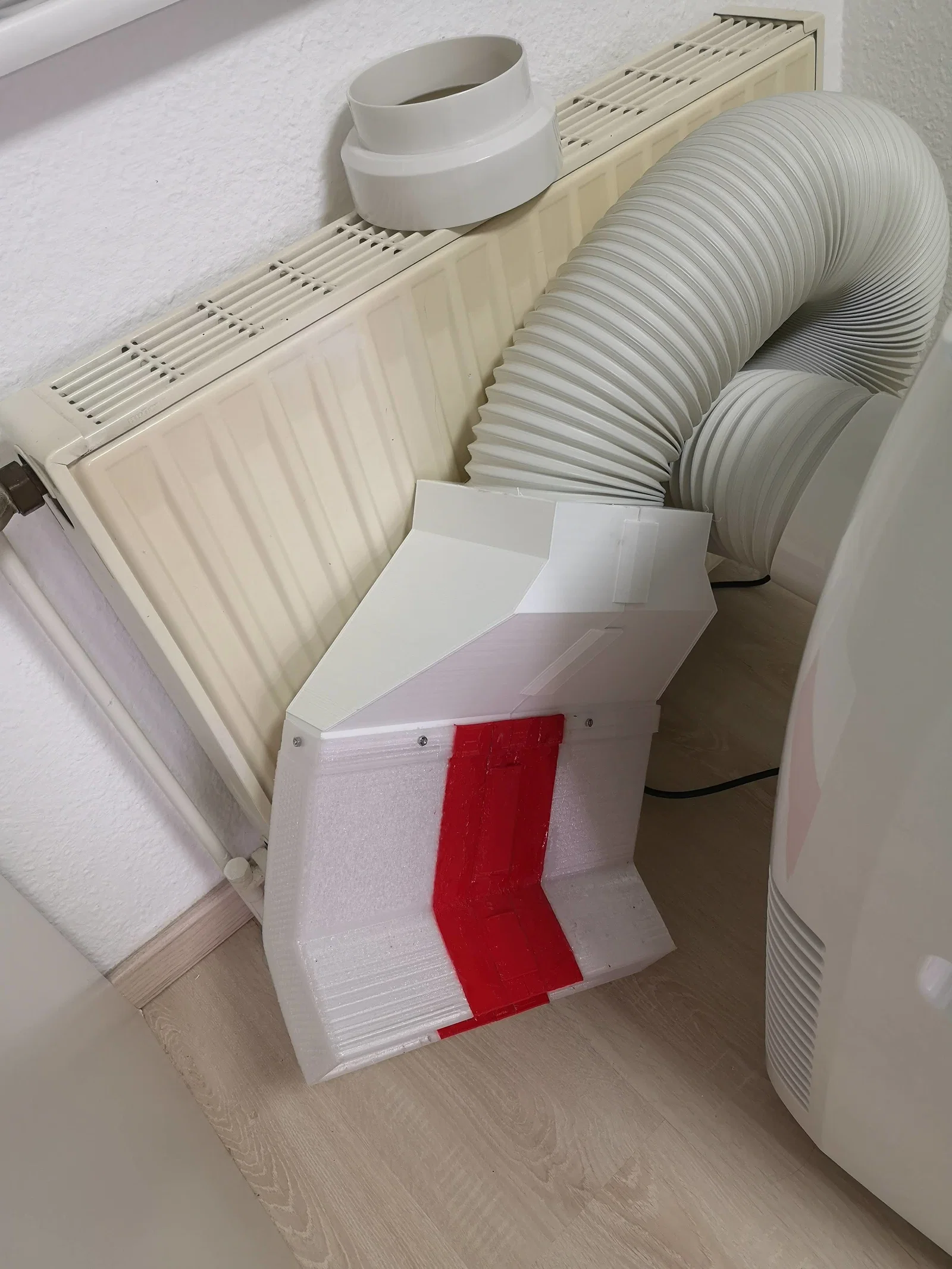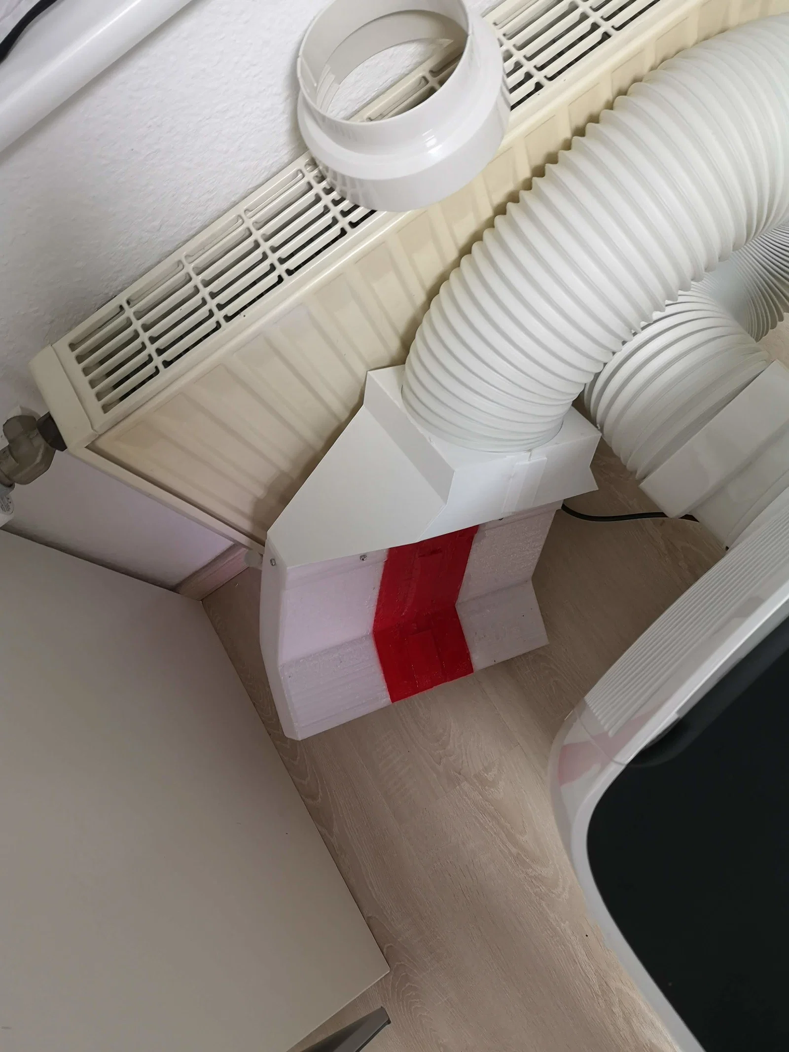 Adapter ống xả khí nóng máy lạnh dạng module, dùng cho cửa sổ có gioăng/đệm kín. Có link Tinkercad, thông số in (PETG, 0,3 mm, brim) và hướng dẫn lắp ráp bằng keo epoxy 2K + ốc M6.