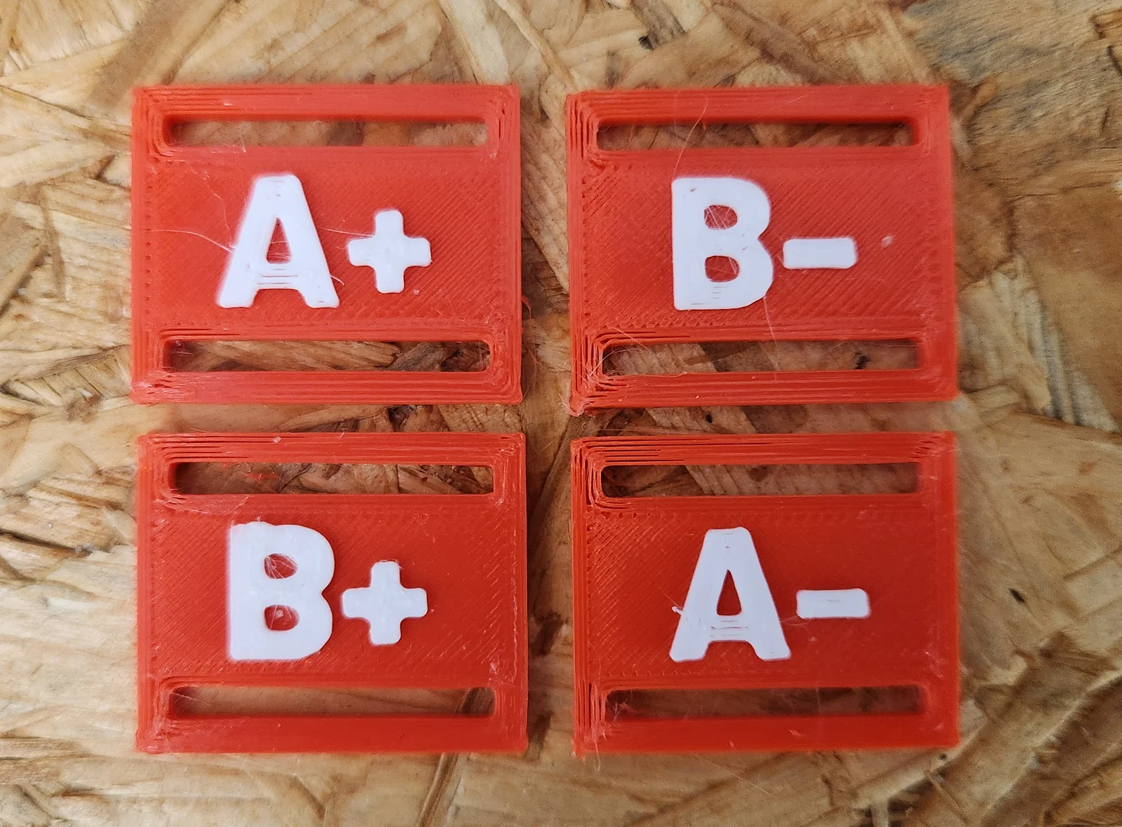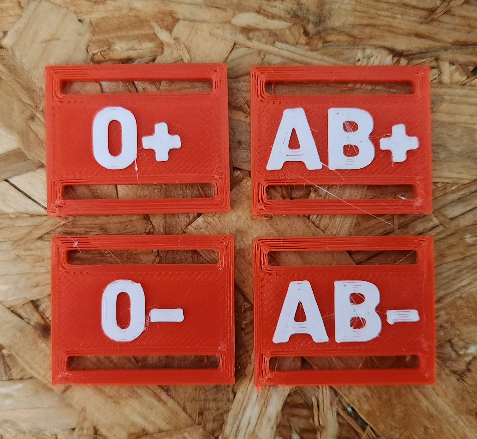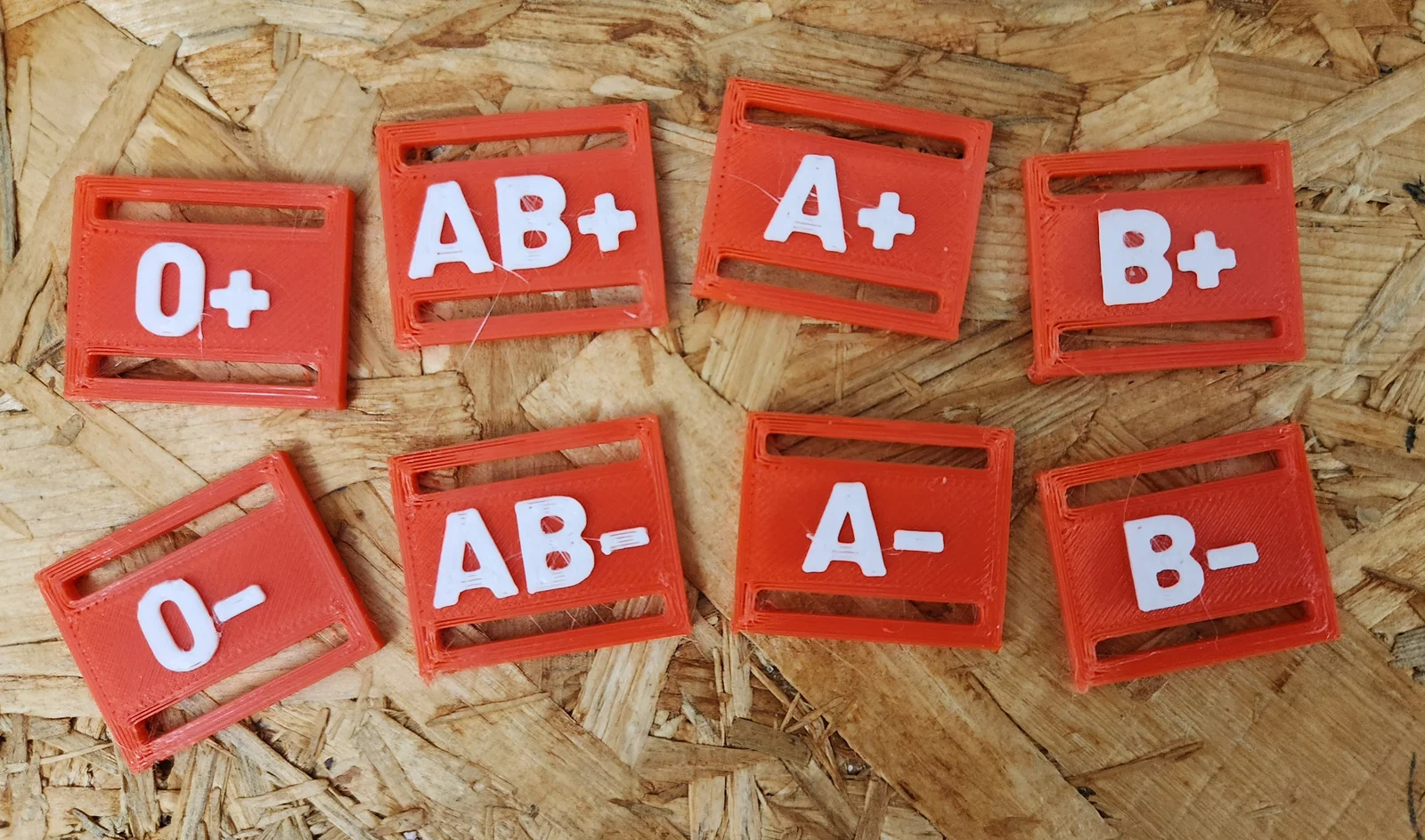 Bảng nhóm máu có thể gắn đơn giản vào dây đai/strap thường có trên balo, nón bảo hiểm hoặc các thiết bị outdoor khác. Các ký tự/số cũng dễ đọc khi in một màu. Tất nhiên vẫn có thể in hai màu với bất kỳ máy in nào, bằng cách dùng lệnh dừng G-code để thay filament.