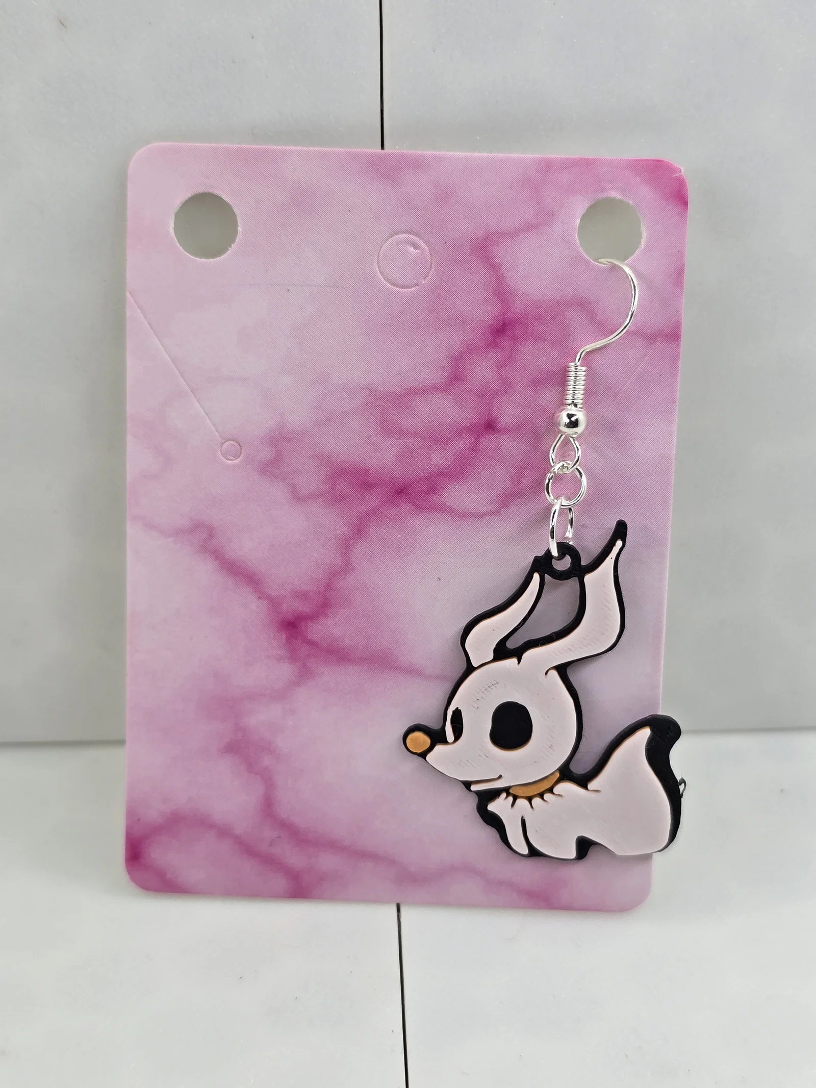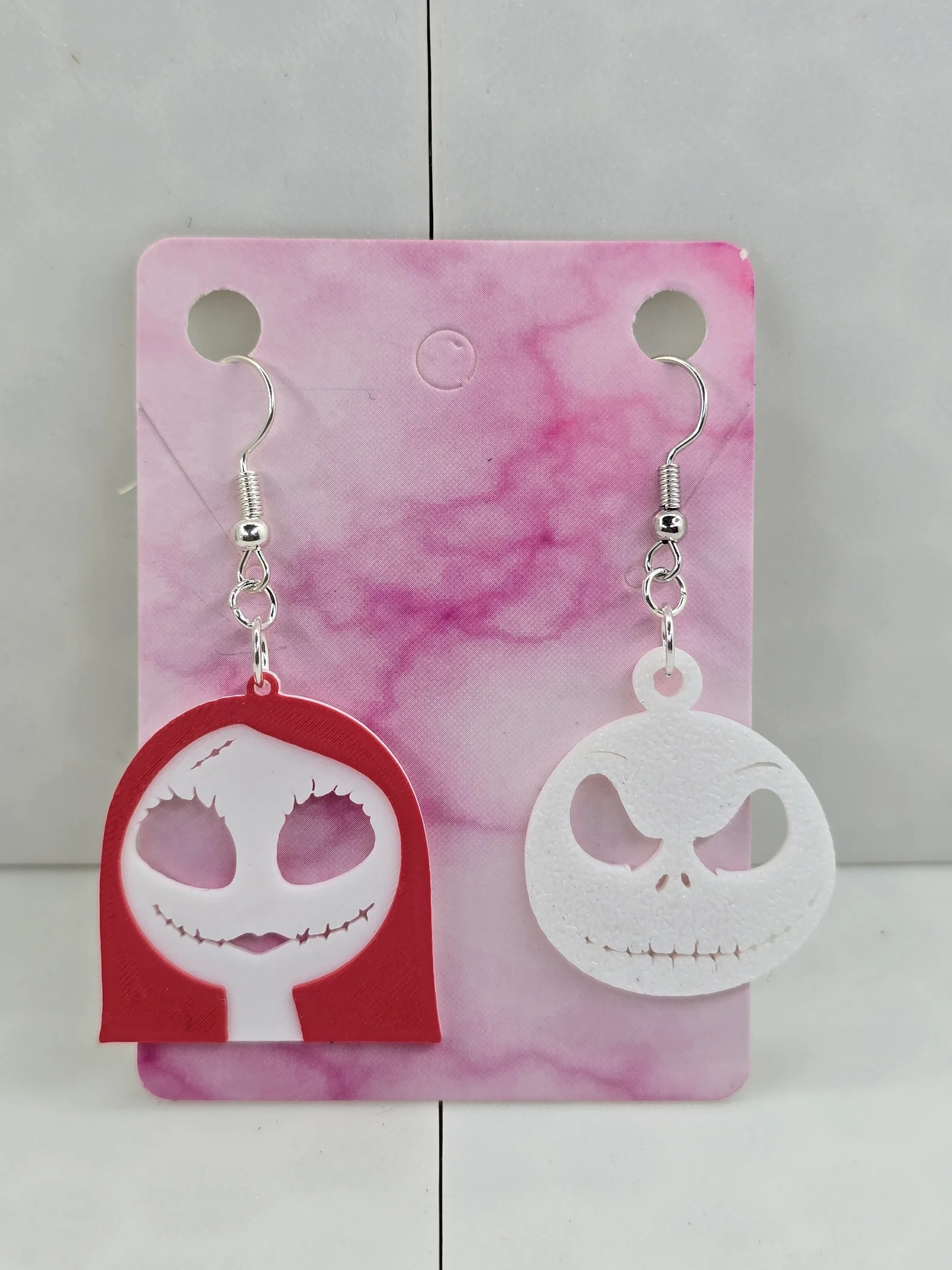Mẫu bông tai Jack Skellington, Sally và Zero in layered, khuyến nghị dùng filament Matte để giảm xuyên sáng. In với nozzle 0.2, không cần AMS nếu đổi màu theo layer. Có thể scale lên để làm pendant hoặc móc khóa.