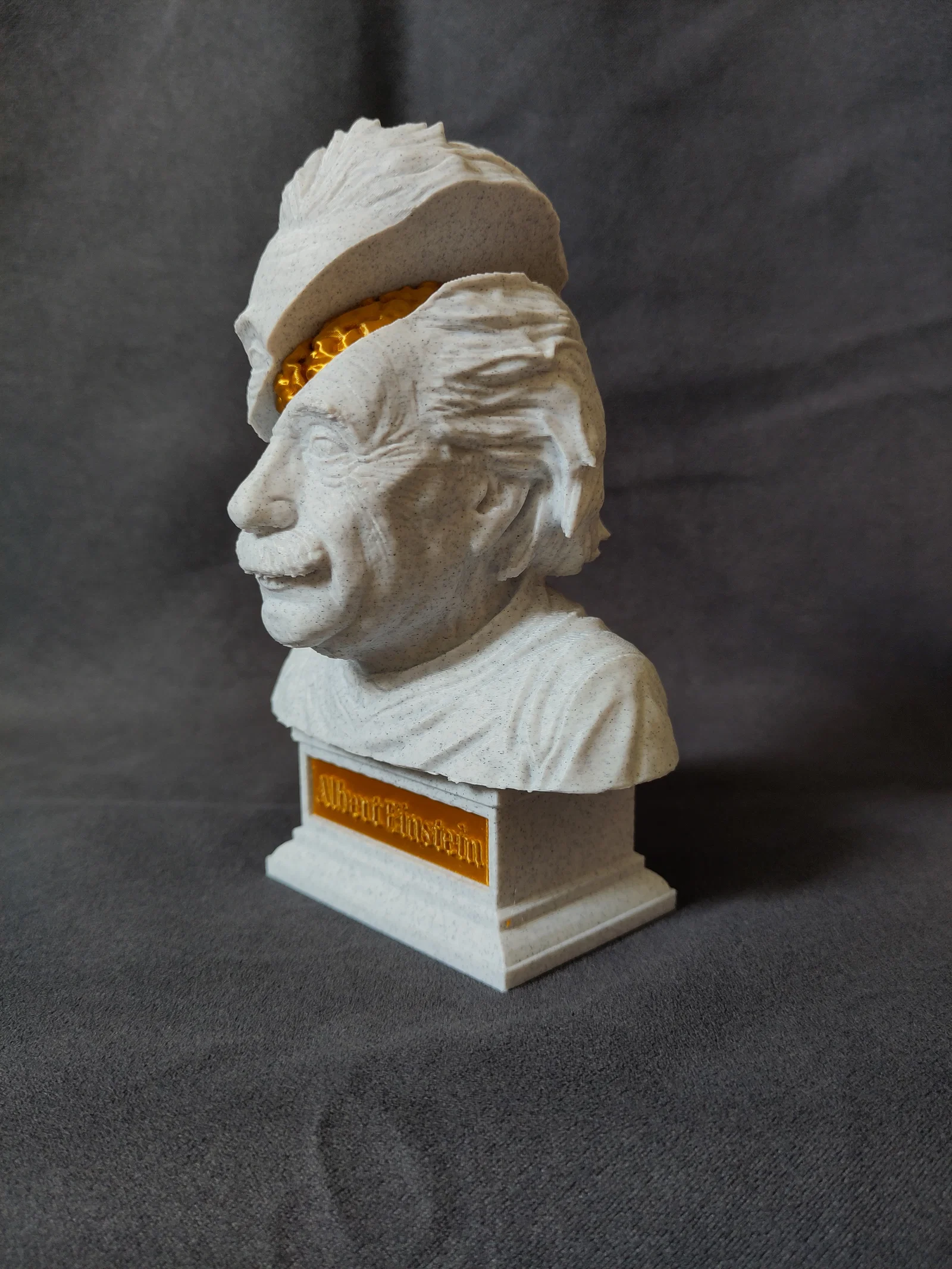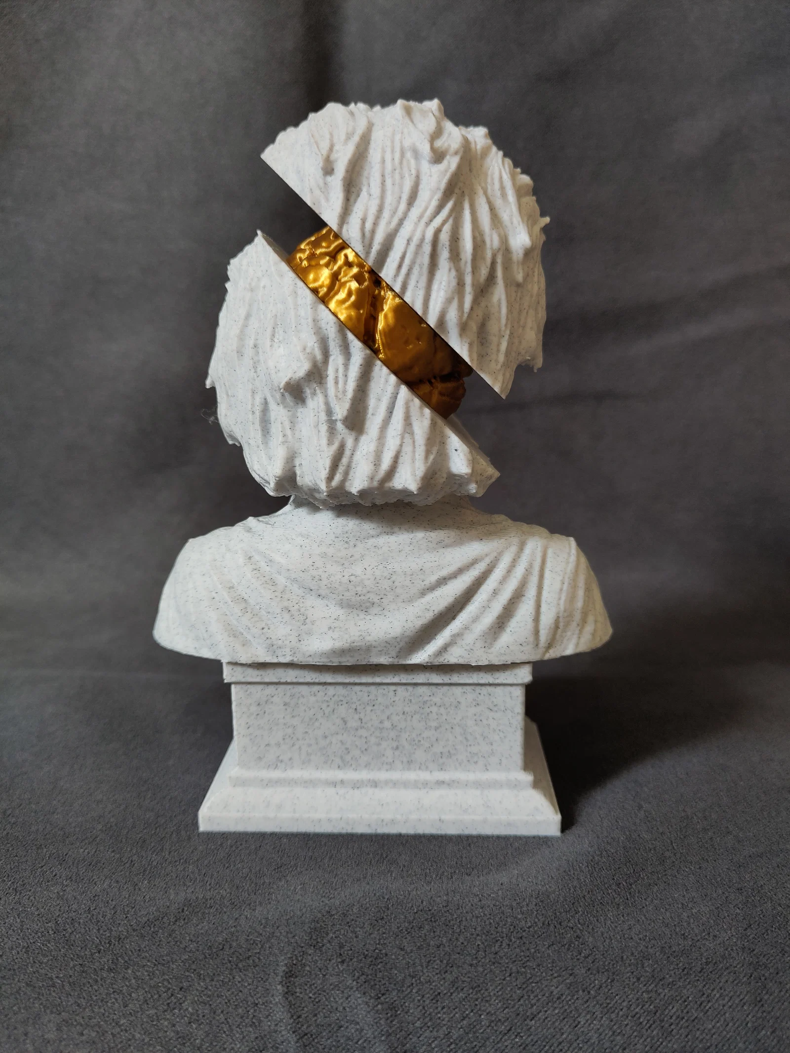 Tượng Albert Einstein dạng tách đôi, nâng phần não để nhấn mạnh biểu tượng thiên tài và thuyết tương đối. File có đủ phần marble/gold, kèm chốt lắp ráp. Thiết kế hướng tới in PLA (Marble, Gold Silk), cao khoảng 14 cm.