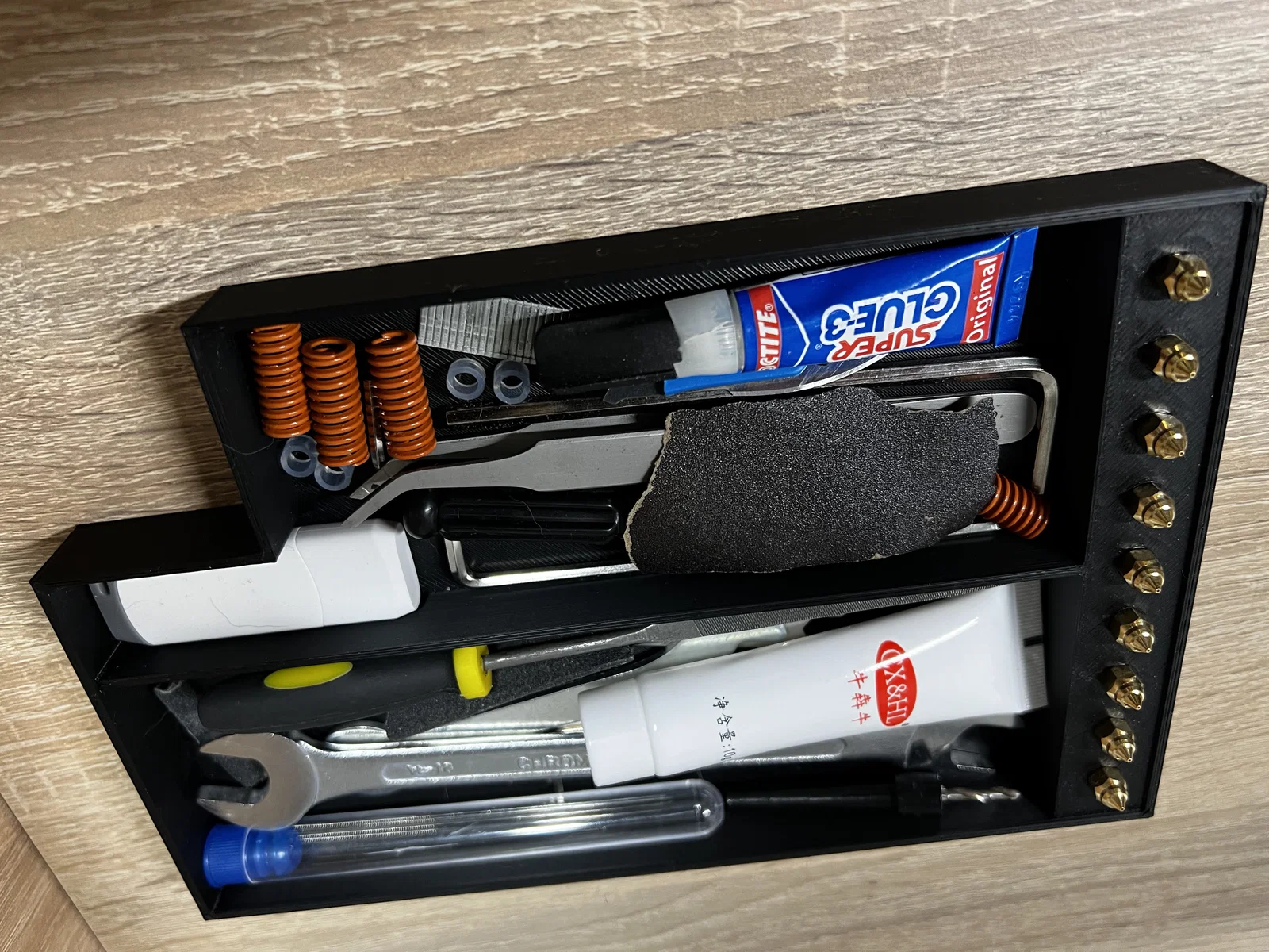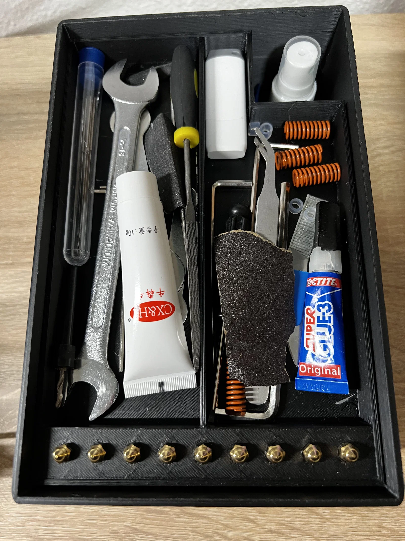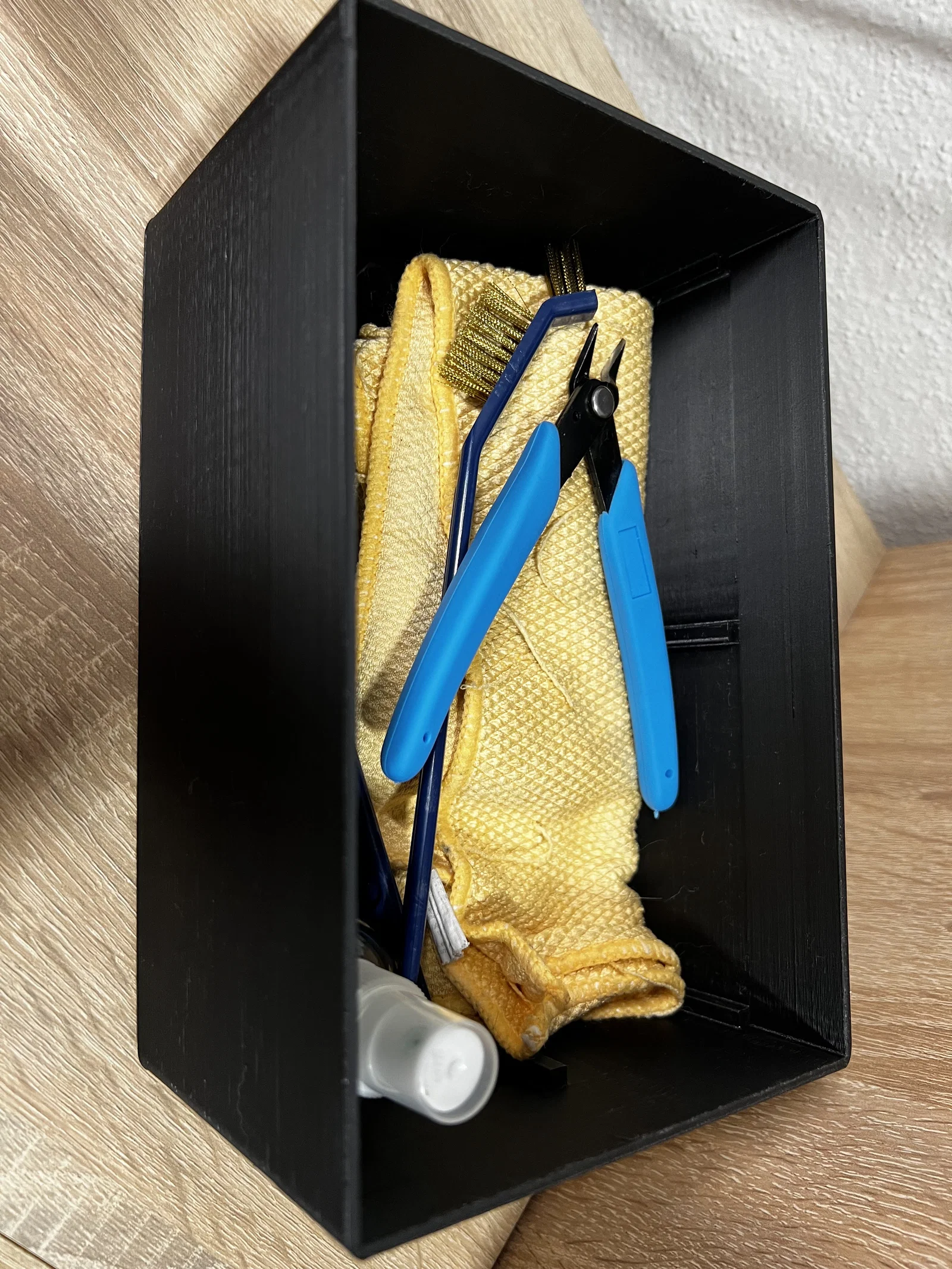 Hộp có ngăn kéo giúp cất và sắp xếp dụng cụ, đầu phun và đồ nghề khi in/post-process. Có khe để hũ isopropyl alcohol (IPA) thò lên không cần tháo ngăn kéo. In PLA, không cần supports; chữ dán thủ công lên nắp.