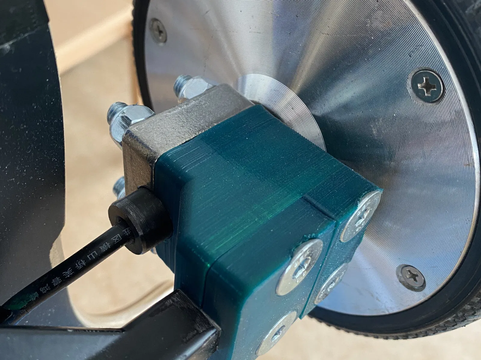 Tôi đã tháo rời bánh xe nguyên bản khỏi ván và mài trục thành hình chữ nhật (14x10mm) để giá đỡ này có thể vừa vặn an toàn. Sau đó, giá đỡ in 3D có thể được bắt vít vào bằng cách sử dụng vít countersunk M8 x 70mm và tấm kim loại từ hoverboard.