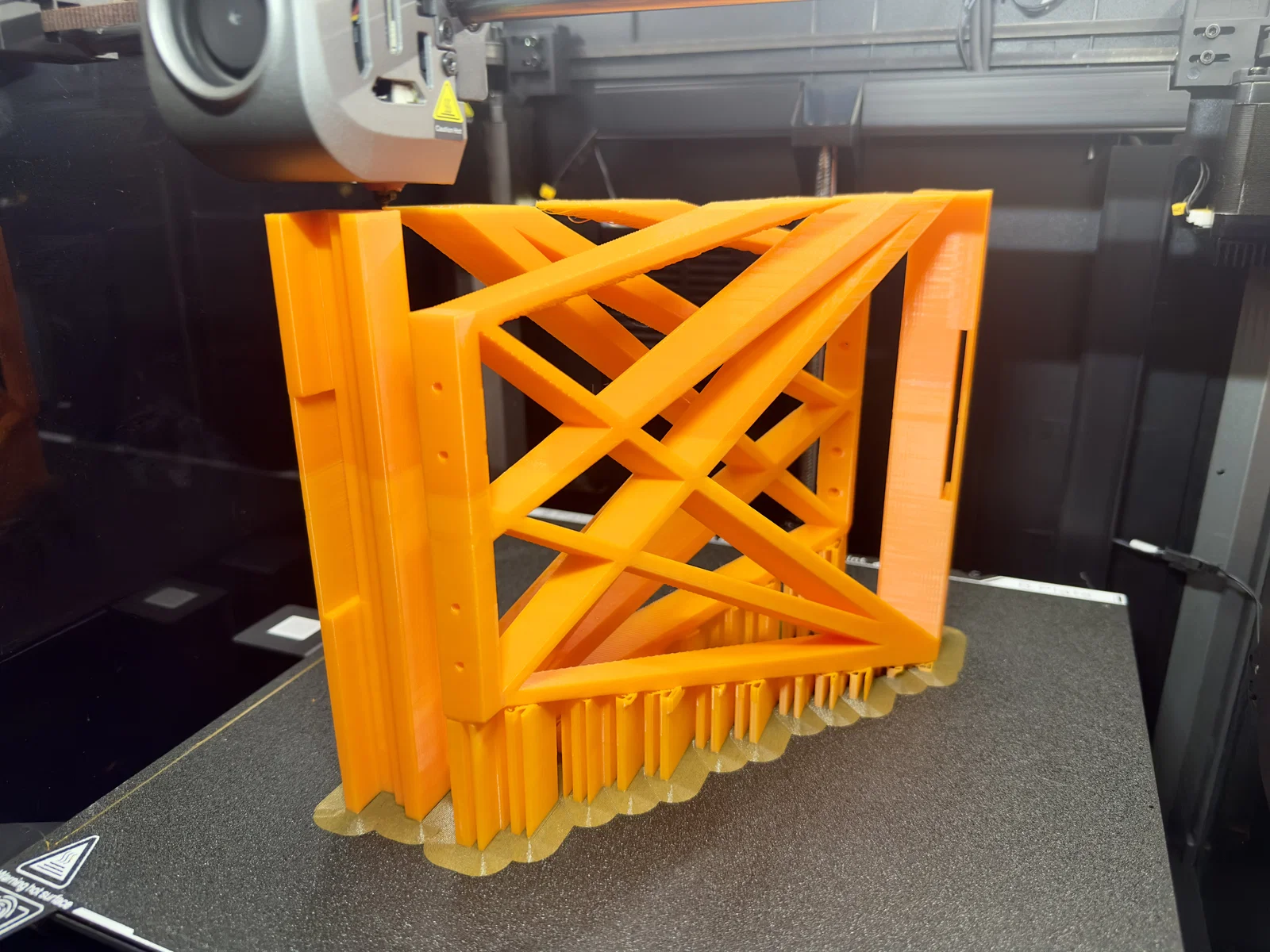 Mình in mấy thanh beam bên hông theo kiểu đặt nằm ngang và nếu làm lại thì mình sẽ in khác đi. Cần có supports, hoặc ít nhất là raft, thì mới làm cái này chạy ổn được.