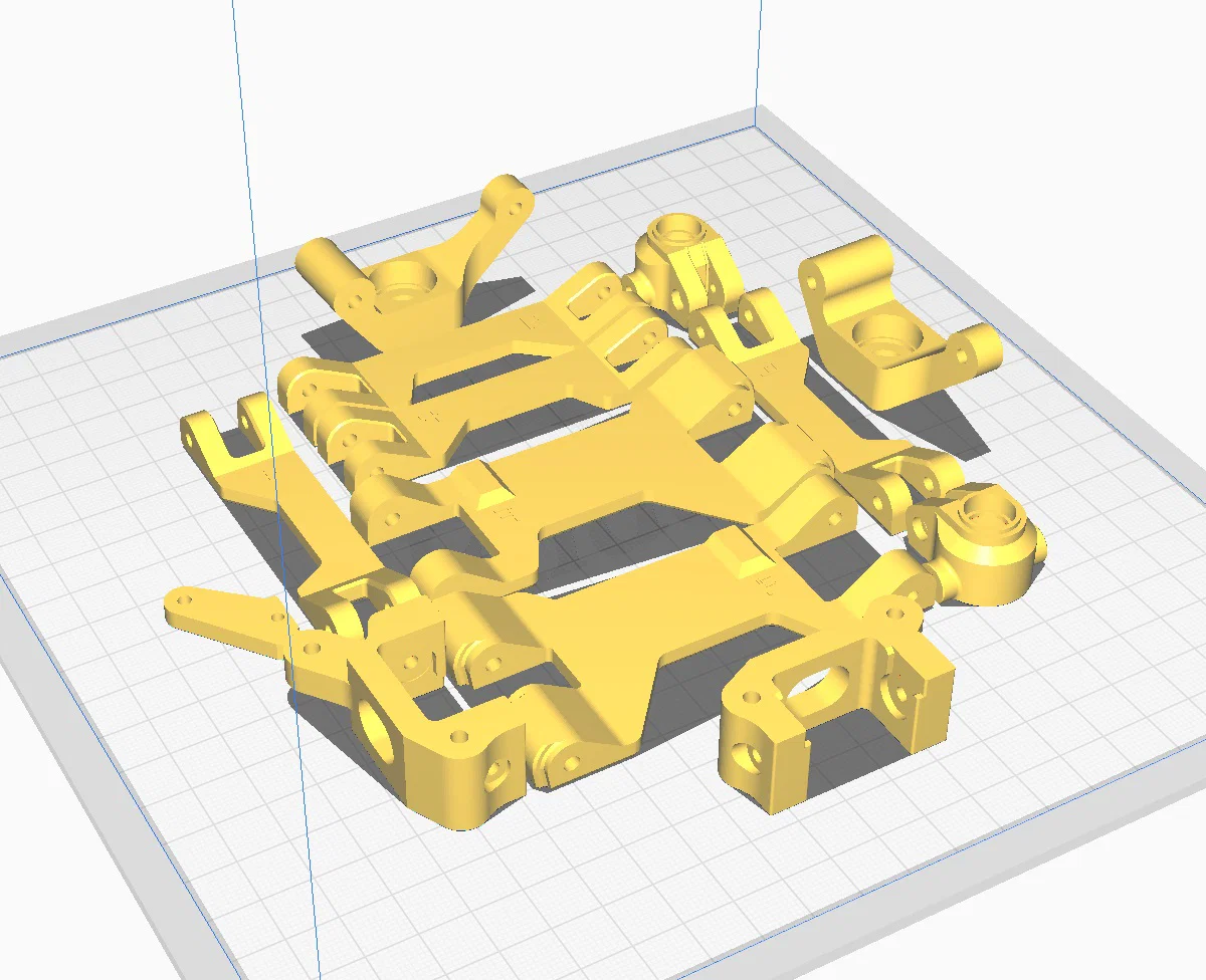 Thiết kế arms: Arms mỏng là chủ ý, để khi crash thì nó gãy trước nhằm bảo vệ drivetrain. Nếu nó gãy ngay cả khi chạy nhẹ nhàng, hãy tối ưu setting in trong slicer. Mình đã test nhiều, nó chịu nhảy tốt ngay cả với vật liệu cơ bản. Thà in lại một cái arm nhẹ còn hơn phải thay một cây halfshaft bị cong hay chassis bị bể. Mình cần phản hồi của bạn—nếu nhiều người báo arms yếu quá thì mình sẽ cải tiến thiết kế.