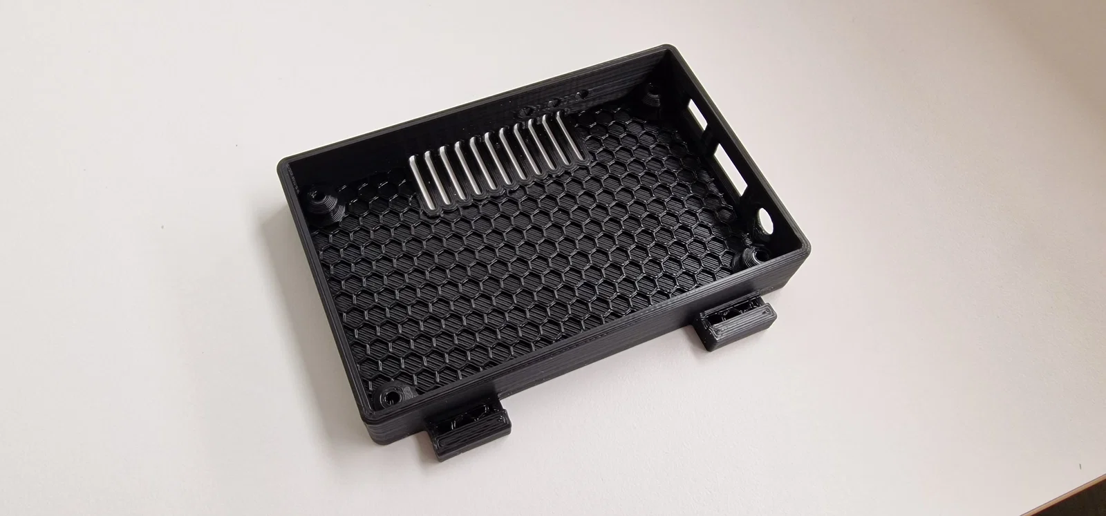 Case in 1 mảnh cho BTT HDMI5, thả vừa vào rãnh của thanh profile 3030 và giữ ở góc nghiêng để cất gọn, hoặc rút ra dùng khi cần. Bắt màn hình bằng 4 ốc M3 lục giác chìm dài 6 mm; in với nozzle 0.6, layer 0.3, không cần supports.