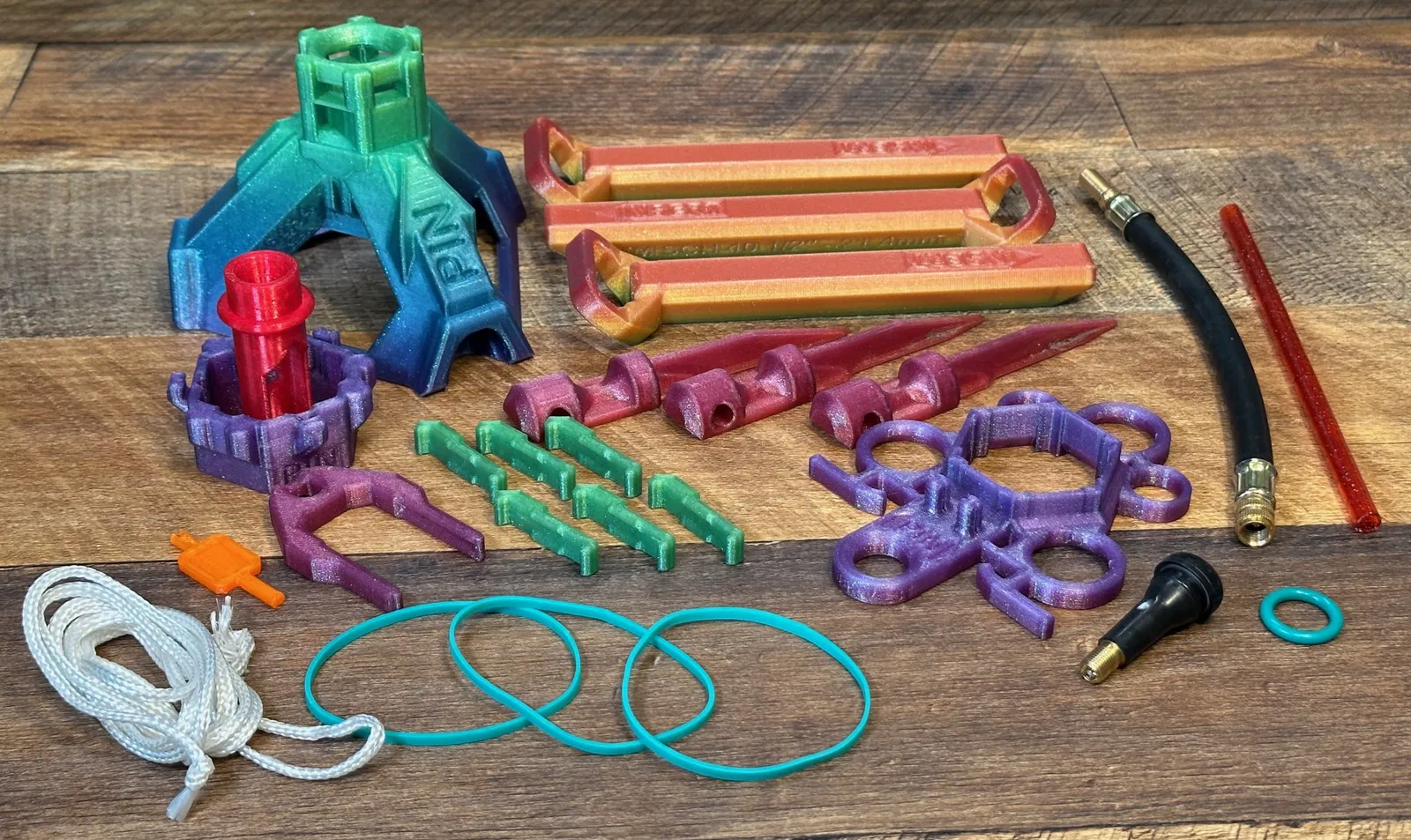 Dự án Tên Lửa Nước Mở của Marimo Labs Thiết kế tại Cambridge, Massachusetts, Hoa Kỳ Miễn phí mãi mãi, ở mọi nơi marimolabs.com v1.44 #### Trình diễn tại Lễ hội Khoa học Cambridge - Tháng 9 năm 2025 270 lần phóng trong 4 giờ! https://marimolabs.com/csc #### Mới! Đầu phóng và cánh cho chai 0.5L Có thể thay đổi với các tùy chọn đầu phóng và cánh khác nhau. Thiết kế cho filament linh hoạt để đảm bảo an toàn và độ bền. <> #### Bộ phóng (trang này) Hệ thống bộ phóng tên lửa nước toàn diện được thiết kế để dễ dàng lắp ráp và tương thích toàn cầu. Đối với những người không có sẵn máy in 3D, bạn có thể mua một bộ với tất cả các bộ phận từ Cửa hàng Marimo Labs. Các bộ phần ống không in cũng có sẵn. #### Tải trọng/cánh cho chai 1.0L Vẫn có sẵn trên trang này, bên dưới - Hướng dẫn video ở trên. - Hướng dẫn bằng văn bản trên Instructables: https://www.instructables.com/Simple-3D-Printed-Water-Rocket-Launcher/ - Thảo luận thiết kế chi tiết tại: marimolabs.com - Đọc và làm theo Hướng dẫn An toàn PDF trên trang tải xuống. ### Tuyên bố miễn trừ trách nhiệm Hey. Các hệ thống áp lực là nguy hiểm. Hãy biết bạn đang làm gì và thực hiện các biện pháp an toàn phù hợp. Tự đánh giá xem dự án này có phù hợp với những gì bạn đang cố gắng làm hay không, và sử dụng với rủi ro của riêng bạn. Đừng cố gắng nếu không có kinh nghiệm, thiết bị bảo vệ và công cụ phù hợp. Hầu hết các hướng dẫn tên lửa nước khuyên không nên nén quá 60psi/4 bar. Luôn cố định bệ phóng xuống mặt đất. ### DANH SÁCH THÀNH PHẦN #### Không In Lựa chọn 1: Cửa hàng Marimo Labs (vận chuyển trong nước Mỹ) - Bộ lõi con với các thành phần không in