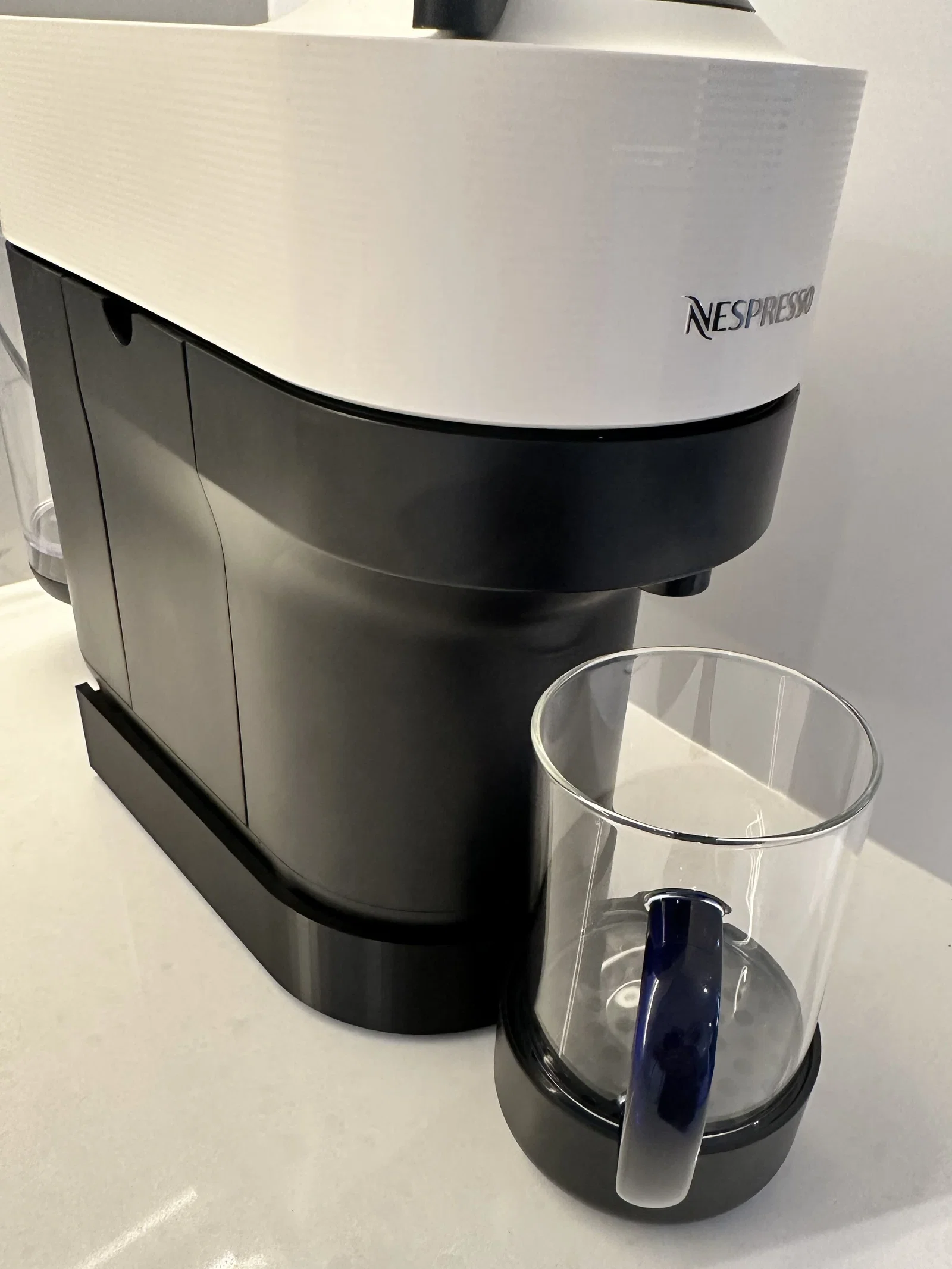 Mình mua cái Nespresso Vertou Pop và thấy ly cà phê bình thường không lọt vô dưới đầu rót. Cái bệ này giúp kê máy cao lên để dùng được các loại mug tiêu chuẩn. Khi pha đồ uống đá thì tháo khay hứng nước nhỏ giọt (cup drip tray) ra. Mình dùng chân cao su 5mm dán dưới bệ để khỏi bị trượt trên mặt bàn. Model được chia làm 2 phần, lắp kiểu press-fit lại với nhau để vừa khít với khay in của mình.