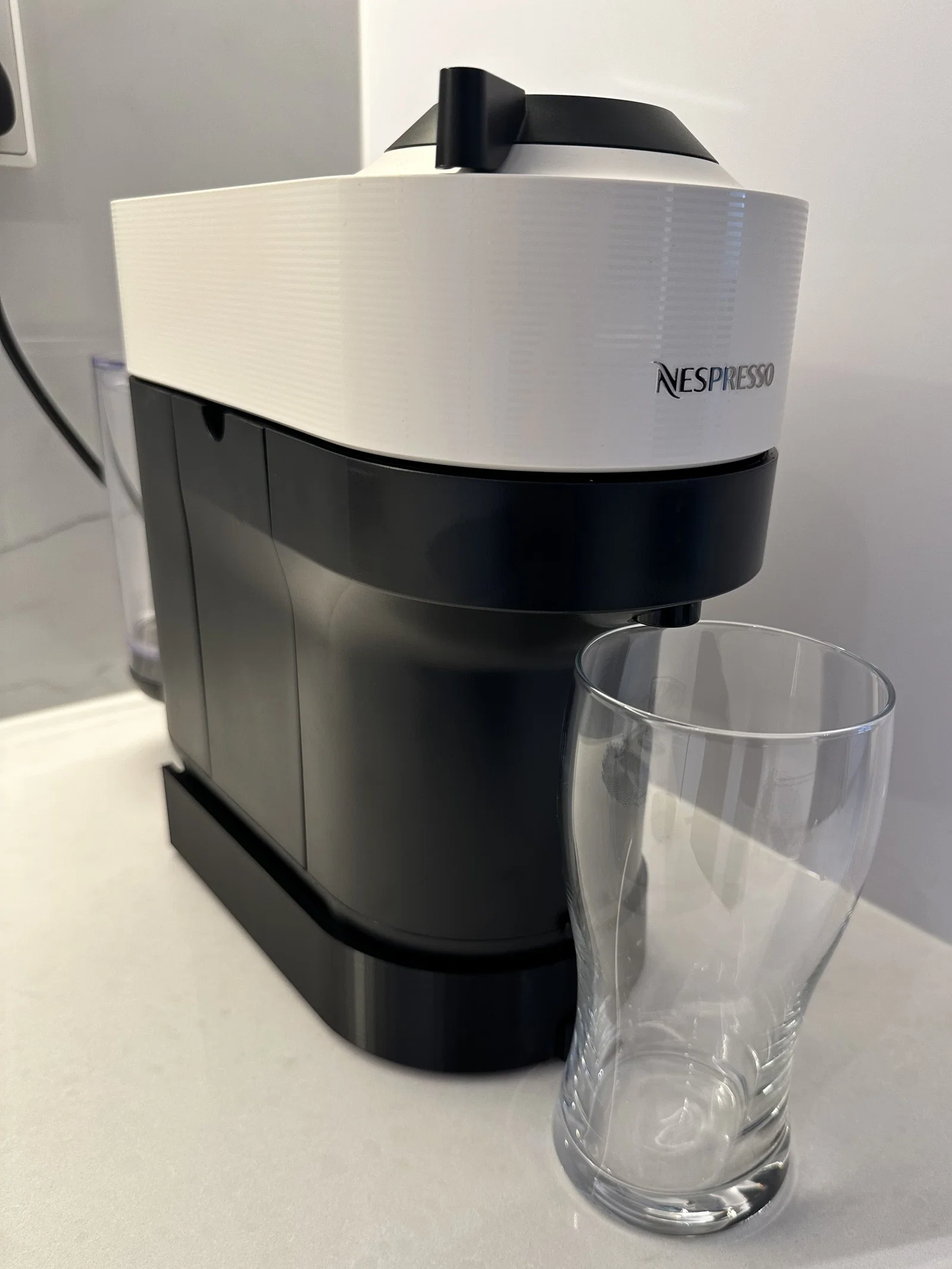 Bệ nâng cho Nespresso Vertuo Pop giúp tăng khoảng hở để dùng mug cà phê tiêu chuẩn. Model tách 2 phần lắp press-fit cho vừa khay in; có gợi ý gắn chân cao su 5mm chống trượt và cập nhật v11 giảm gờ 2mm.