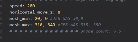 Mình có ảnh chụp màn hình về BL offset so với nozzle, và cả phần mình phải chỉnh trong ender 5 plus .cfg, mục [bed_mesh]. Những dòng mình sửa có ghi chú #JEB WAS……..