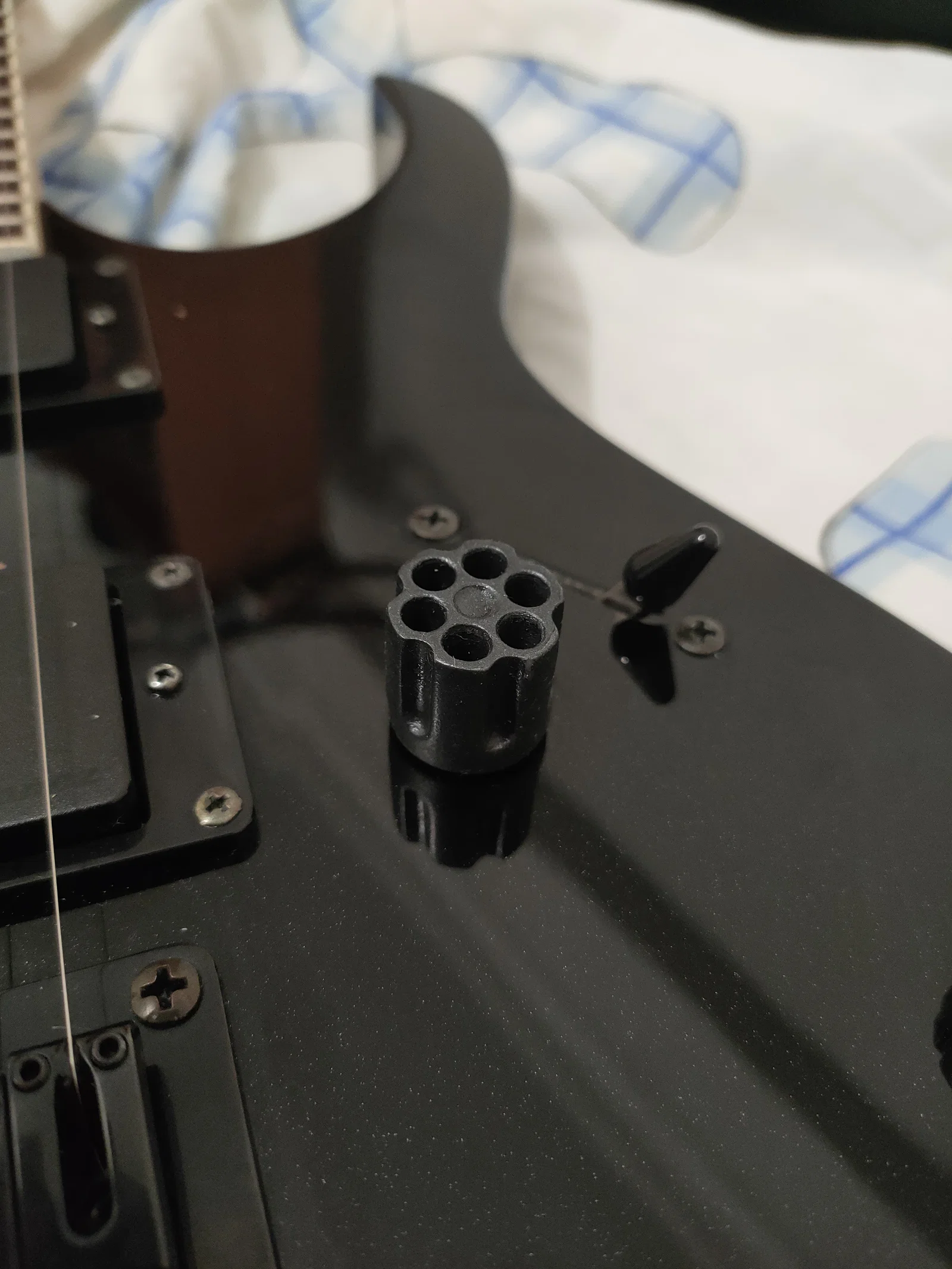 Mình mới mua cây Ibanez GRG121EX được vài tuần, cũng còn khá mới với âm nhạc và mấy cái này. Để custom cây đàn, mình làm một cái núm vặn hình ổ đạn revolver.