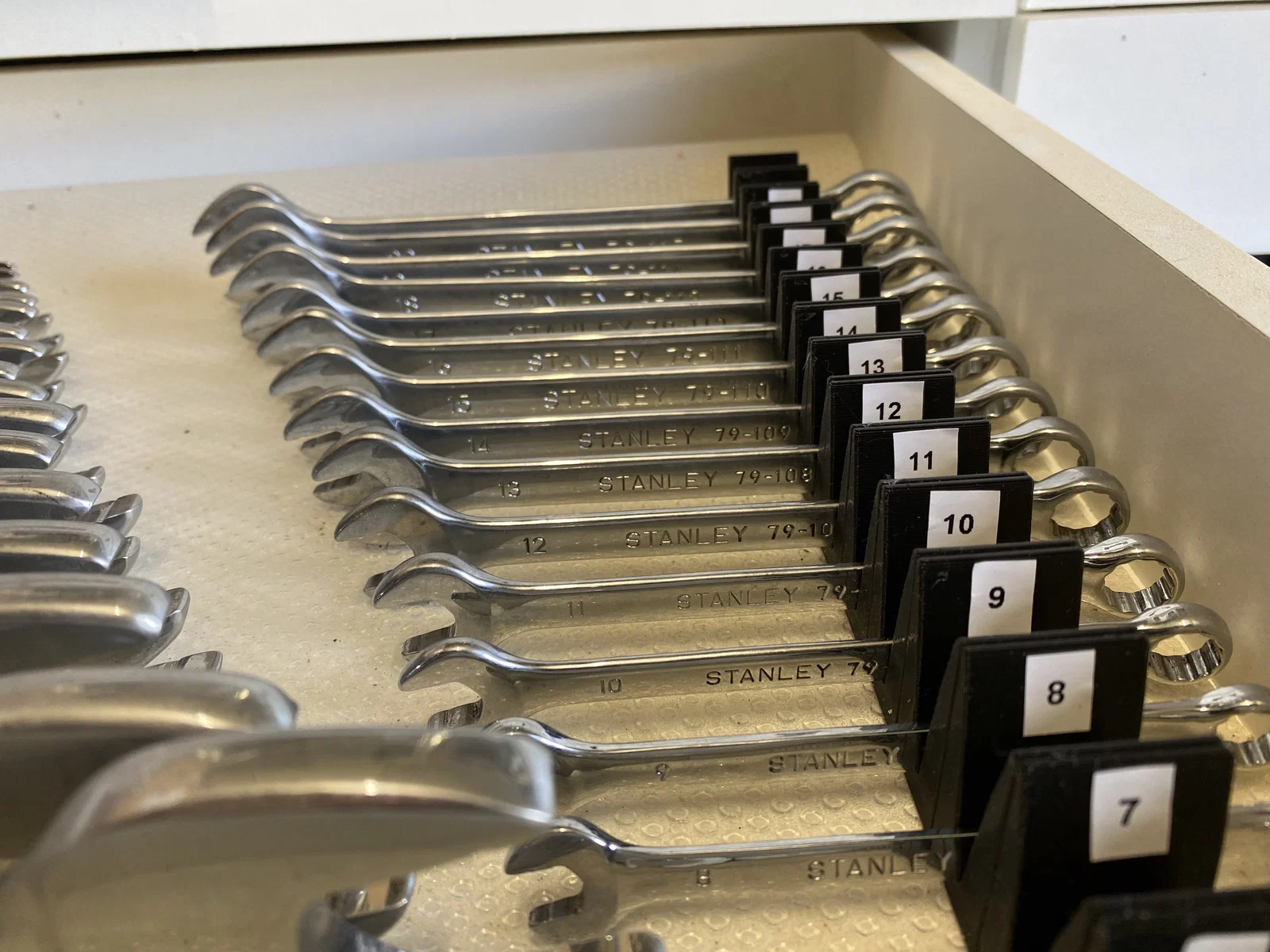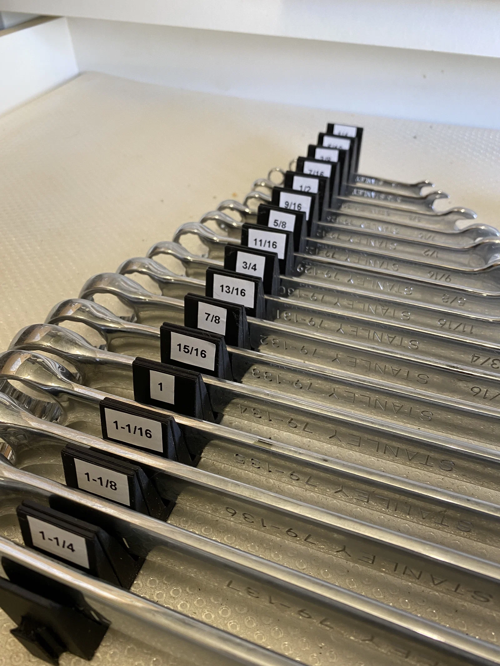 Mình tạo ra bộ giá đỡ dụng cụ dạng modular này, lấy cảm hứng từ mấy toolbox widgets nhưng có chỉnh sửa theo ý mình. Phần dovetail giúp bạn thêm hoặc tháo bớt từng holder để hợp nhu cầu. Dùng được cho spanner và screwdriver, có khi cả đục (chisel) nữa. Như bạn thấy, nó kẹp được từ spanner nhỏ cỡ 6mm cho tới hơn 30mm.
