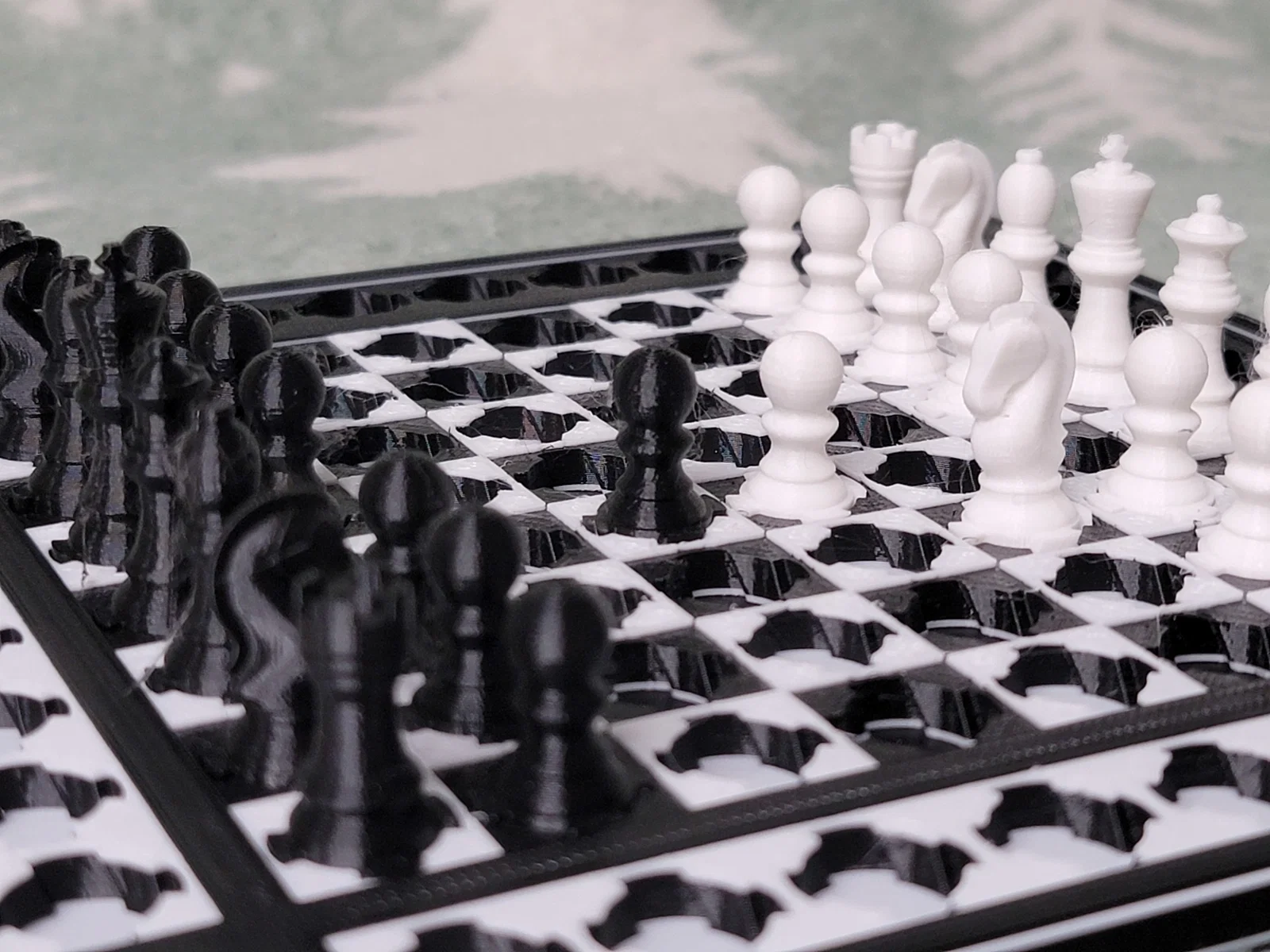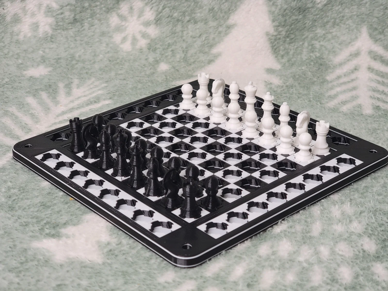 Bàn cờ vua du lịch có rãnh khóa giúp quân cờ cắm chắc và khó rơi khi chơi lúc di chuyển. Có thêm khe giữ quân quanh viền để đặt quân bị ăn. Khi in cần pause đổi màu nhiều lần; nên dùng PrusaSlicer variable layer height.
