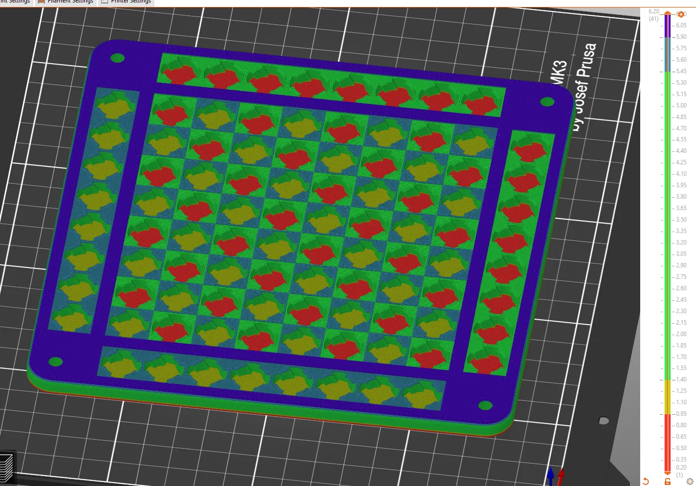 Phần “căng” nhất là lúc in bàn cờ: bạn cần pause và đổi màu (colour change) vài lần. (Mình cũng khuyên dùng variable layer height của PrusaSlicer để tăng số lớp cho các phần màu trắng khác nhau, giúp chúng hiện rõ hơn.) Ví dụ nếu bạn in với layer height 0.15mm: bắt đầu bằng màu đen, rồi khoảng tại 0.95mm thì chuyển sang trắng, sau đó về lại đen ở 1.4mm, rồi chuyển sang trắng lần nữa ở 5.45mm, và cuối cùng về lại đen ở 5.90mm.