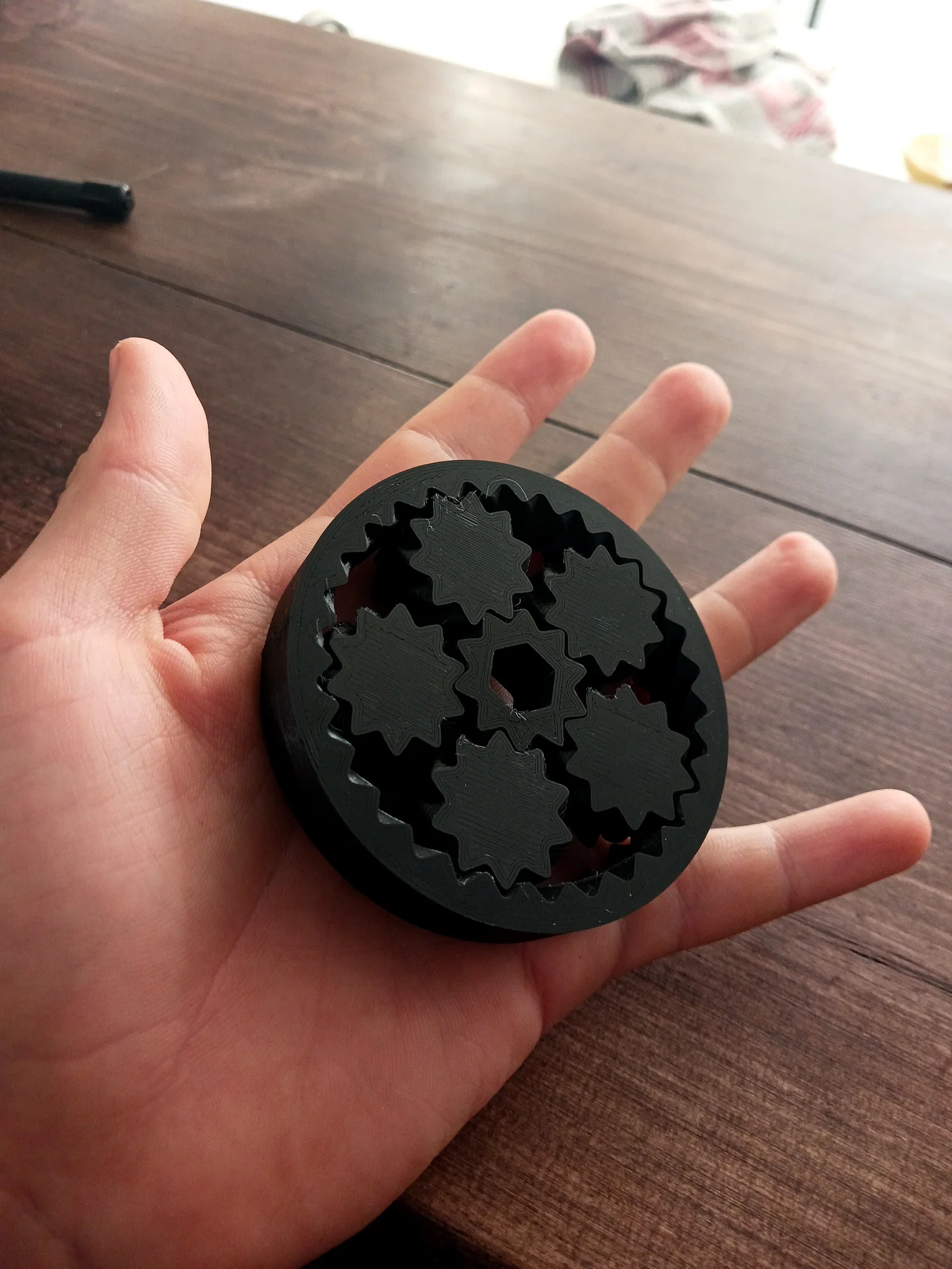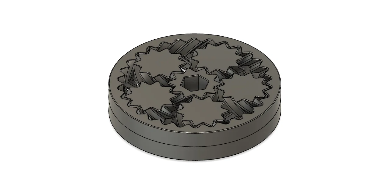 Mẫu này in nhanh, dưới 2 tiếng. Cũng rất thân thiện cho người mới, với dung sai lớn 0.3 mm nên kể cả bed leveling chưa chuẩn thì in ra vẫn đẹp và hoạt động bình thường. Nếu vì lý do nào đó bị dính, bạn có thể dùng lục giác (allen key) để gỡ cho chạy lại (khoảng 9 mm bề ngang).