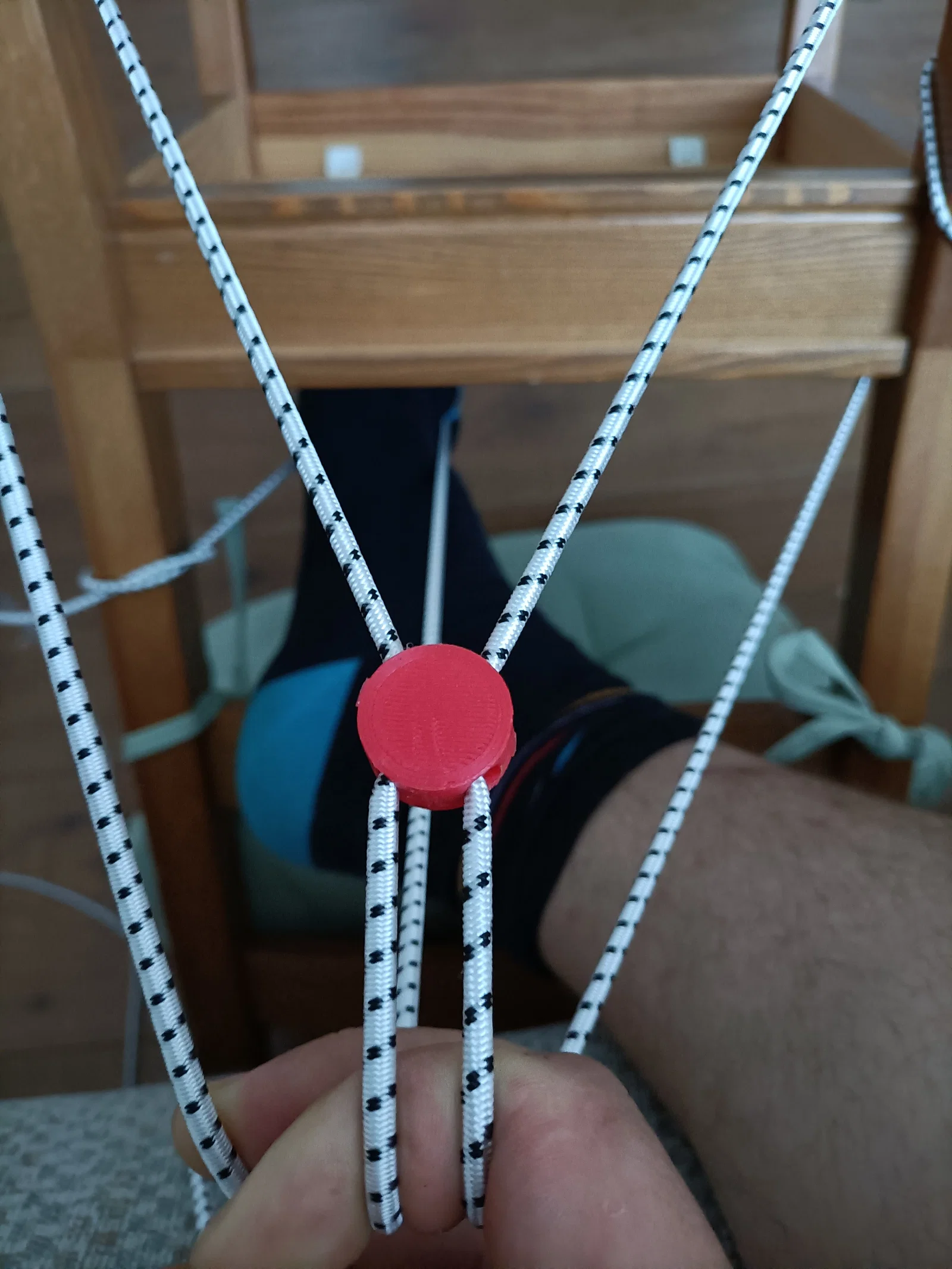 Hub giúp bẻ dây 90° để đan lưới cargo net tự siết cho balo/rucksack, cho phép lấy đồ nhanh. Dùng với dây bungee 4mm, in PLA 25% infill; bản split có lỗ 2mm để gắn chốt filament canh vị trí.