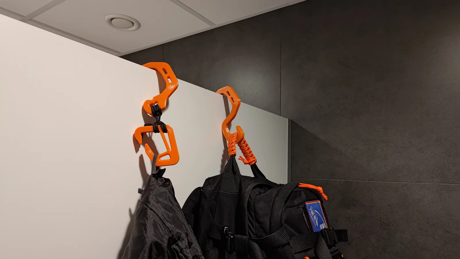 Móc treo gear 3D printable kèm carabiner, dùng như table hook để treo balo/áo khoác ở nhiều vị trí khó treo. In PETG, hỗ trợ bản Rev B chắc hơn và cả bản paracordless; có kèm file .step để remix.
