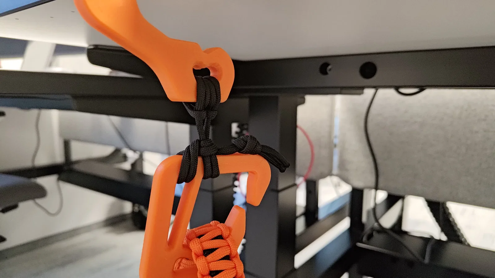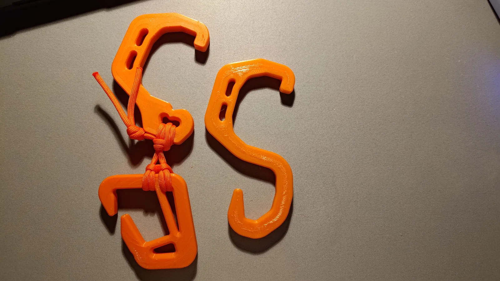 Cần khoảng 60 cm (2' cho mấy bạn ở bên kia Đại Tây Dương) paracord hoặc dây khác để lắp phần tablehook và phần carabiner. Cũng có thể dùng không cần carabiner (xem hình đính kèm thứ 2) nhưng khi đó chỉ hoạt động như móc treo bàn. Nếu muốn treo đồ lên cửa hoặc cửa nhà vệ sinh công cộng thì cần đủ cả hai phần, hoặc ít nhất là phần hook kèm carabiner kim loại. Mình không có cái carabiner đủ bự trong bộ gear nên quyết định đi theo hướng 3D printable.