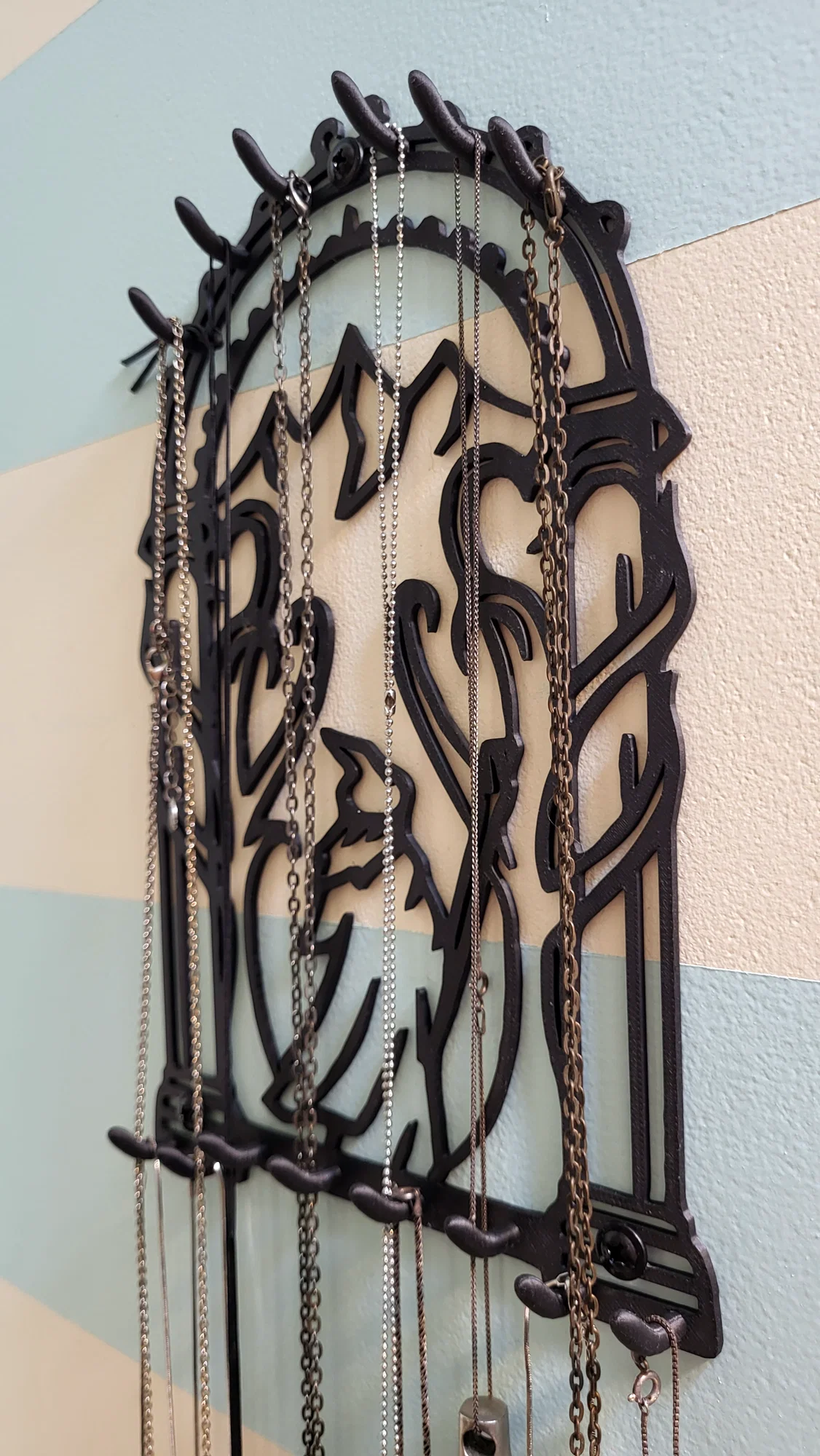Wall art Gandalf ở Cửa Durin kèm 14 móc treo dây chuyền và bông tai. Kích thước khoảng 250×165×22mm, móc dài 20mm (Ø5mm), cách nhau 15–20mm. Khuyến nghị in 100% infill, không cần supports.