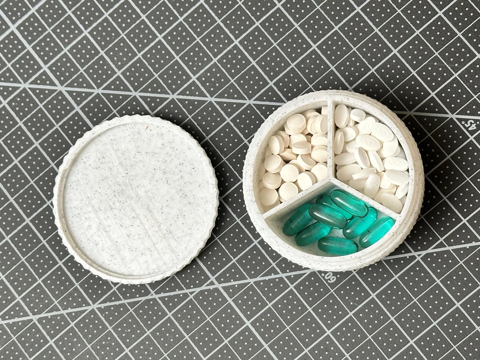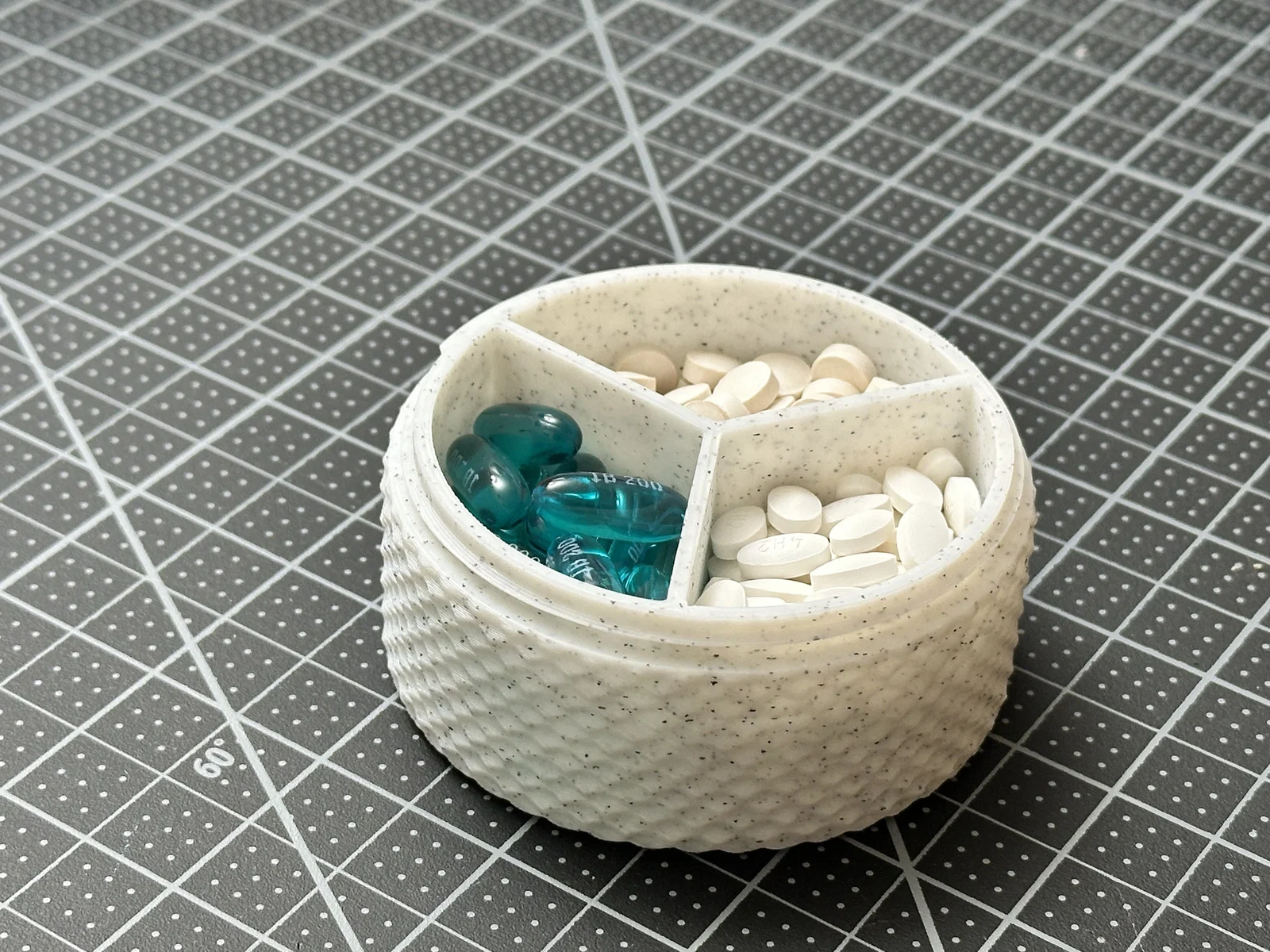 Hộp thuốc du lịch dễ thương với 3 ngăn và bề mặt có vân đẹp mắt. Đáy ngăn bo tròn giúp lấy thuốc dễ hơn. Có sẵn 2 kích thước và file OpenSCAD parameterized để tự tuỳ chỉnh (cần BOSL2).