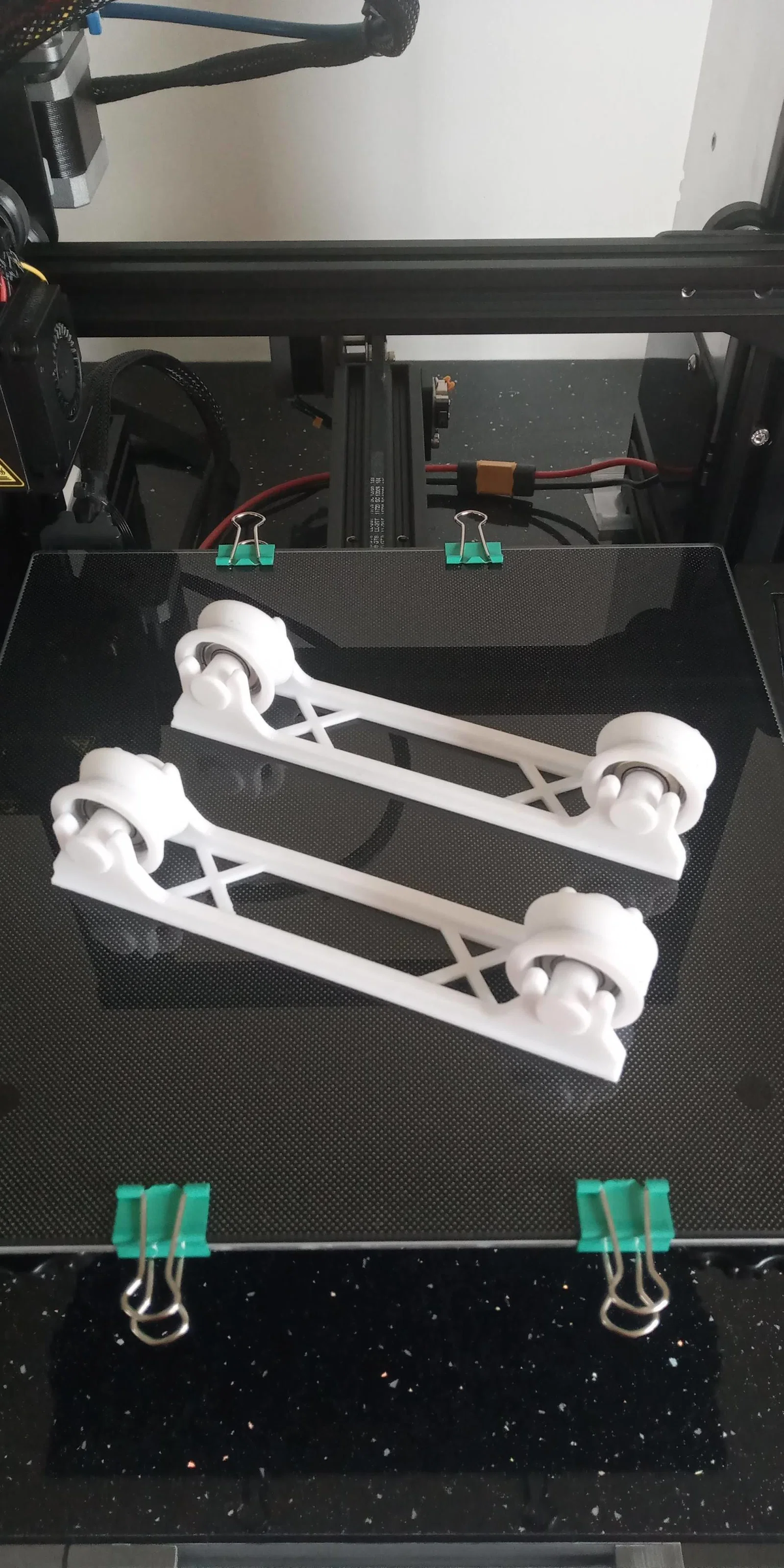 Cần 4 vòng bi z608. Chỉ việc ấn vòng bi vào bánh xe, rồi đẩy ngàm giữ vòng bi dạng 2 mảnh xuyên qua tâm vòng bi từ hai phía. Sau đó đặt cụm vòng bi vào phần hõm (recess) trên kệ đỡ cuộn. Không cần ốc vít hay keo dán.