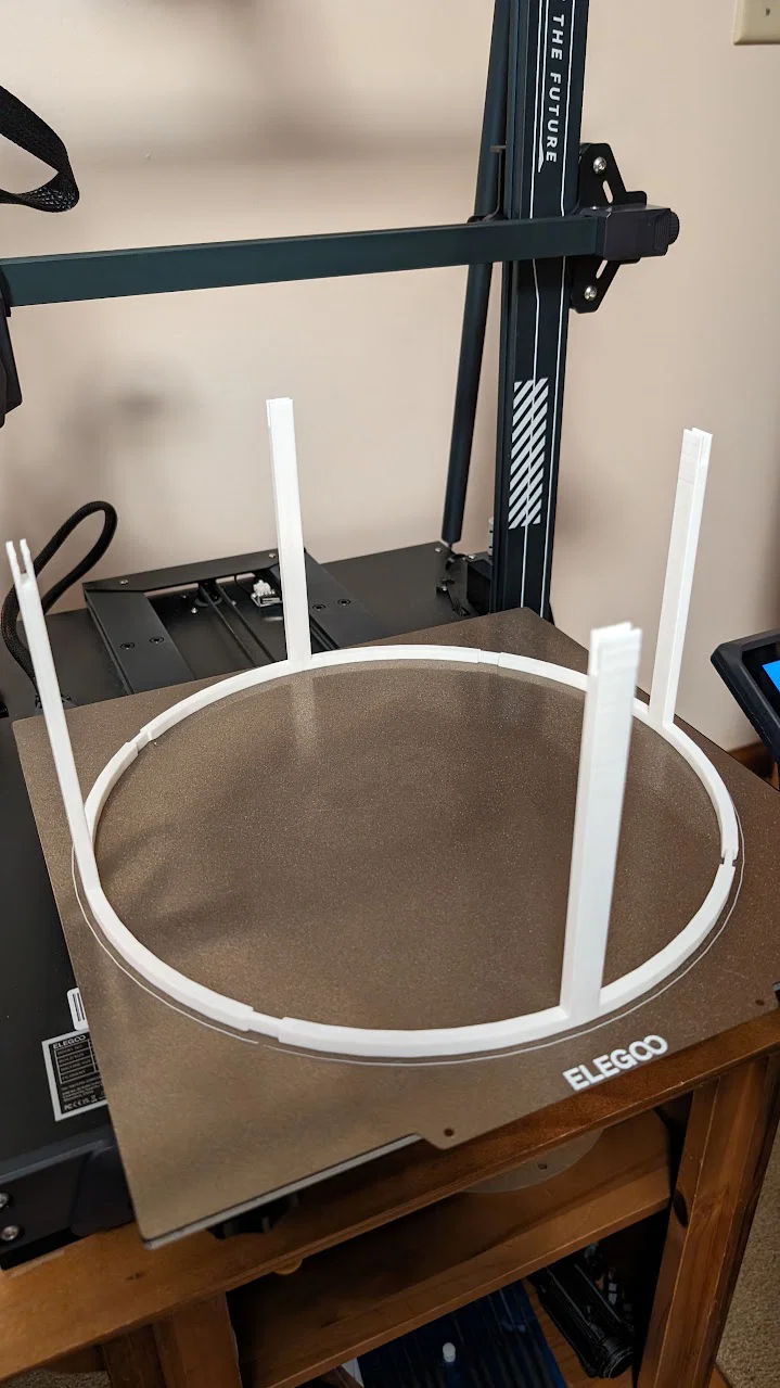 Khung đỡ cà chua dạng modular/stackable giúp cây đứng thẳng. Vòng 12" và chân 6", có rãnh để gắn chân; có thể bắt đầu một tầng rồi lắp thêm khi cây lớn. Khuyến nghị ASA cho ngoài trời, PLA vẫn dùng được.