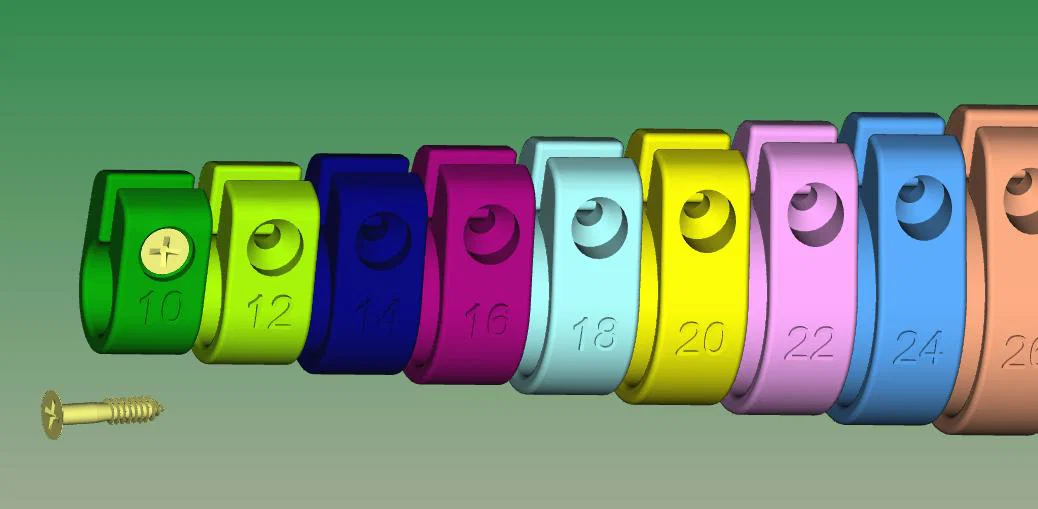 Bộ kẹp (clamp) Schellen kích thước 10–50 mm, tăng theo bước 2 mm, dùng với vít Spax. Phù hợp nhiều nhu cầu sửa chữa; chọn vật liệu tùy ứng dụng. Gợi ý vít 3×15 hoặc 3×20 mm, in không cần raft/support.