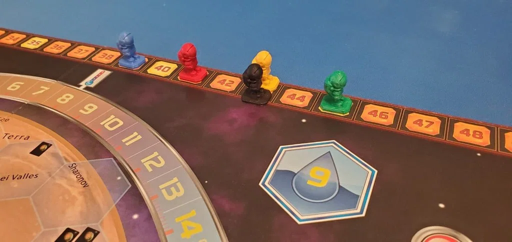 Token người chơi dạng phi hành gia cho Terraforming Mars: mẫu MatterHackers 3D Phil được đặt lên bệ và thu nhỏ đúng cỡ marker. Phần đế thiết kế vừa khít rãnh thang TR trên bàn chơi.