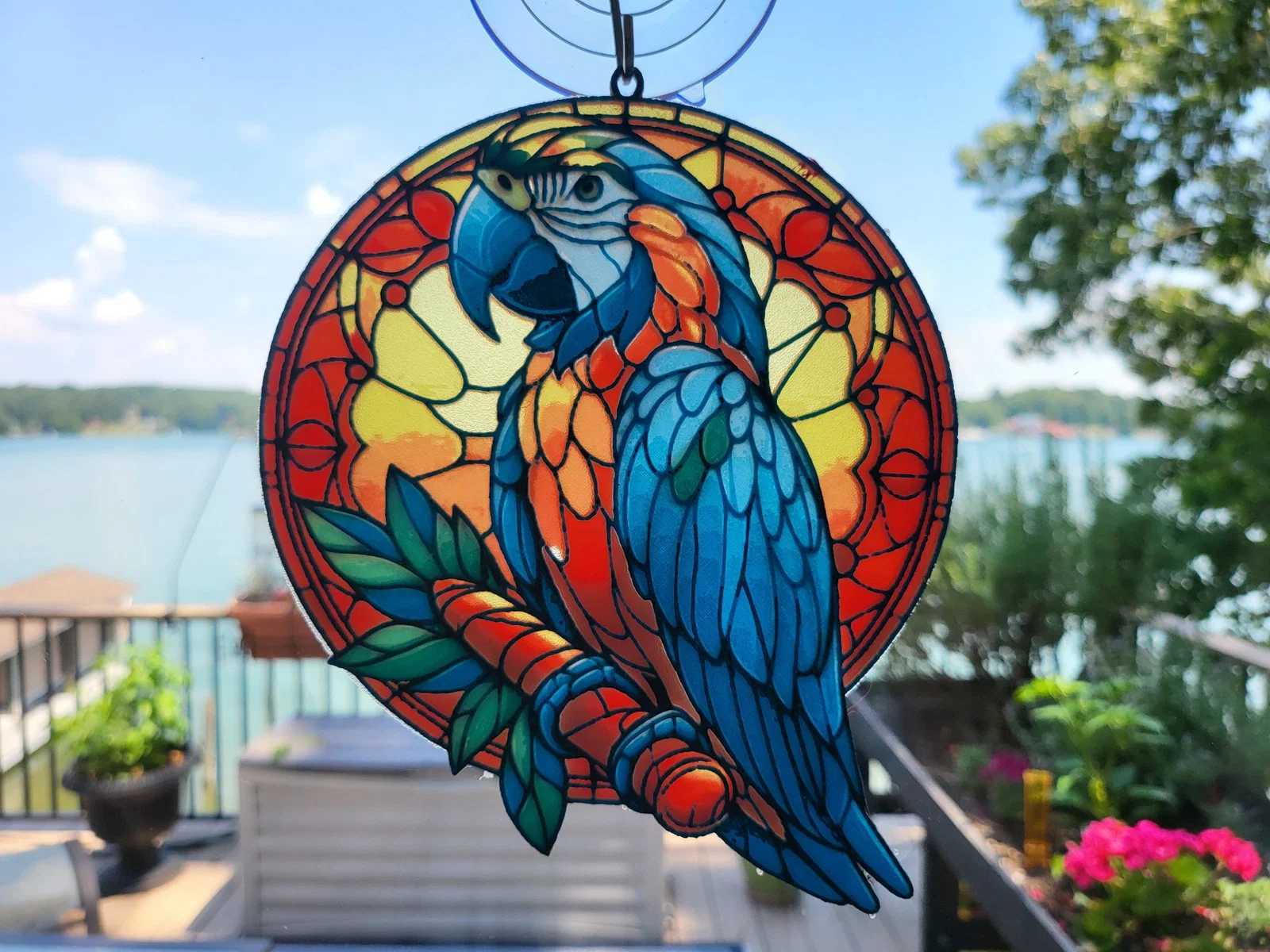 Mẫu HueForge Stained Glass Macaw phong cách kính màu, in thành 2 phần để tạo lớp tiền cảnh và nền. Dùng layer 0.08mm, 100% infill, có hướng dẫn đổi filament theo Transmission Distance và lưu ý gỡ/dán ghép thật kỹ.
