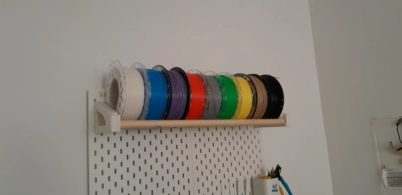 Bản remix giá treo cuộn filament cho IKEA Skadis: mình làm lại phần móc để ôm bảng chắc hơn và tinh chỉnh vài chi tiết nhỏ. Khuyến nghị in infill cao, dùng support + raft; PLA được, ABS/ASA càng ổn.