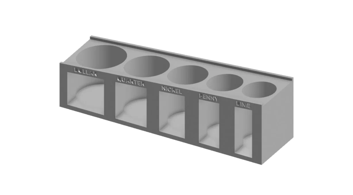 Mẫu Coin Sorter (US Coins) giúp phân loại tiền xu Mỹ: dime, penny, nickel, quarter và dollar. Thiết kế hỗ trợ sắp xếp gọn gàng, dễ lấy và sử dụng, giảm mất công tìm từng đồng trong đống xu.