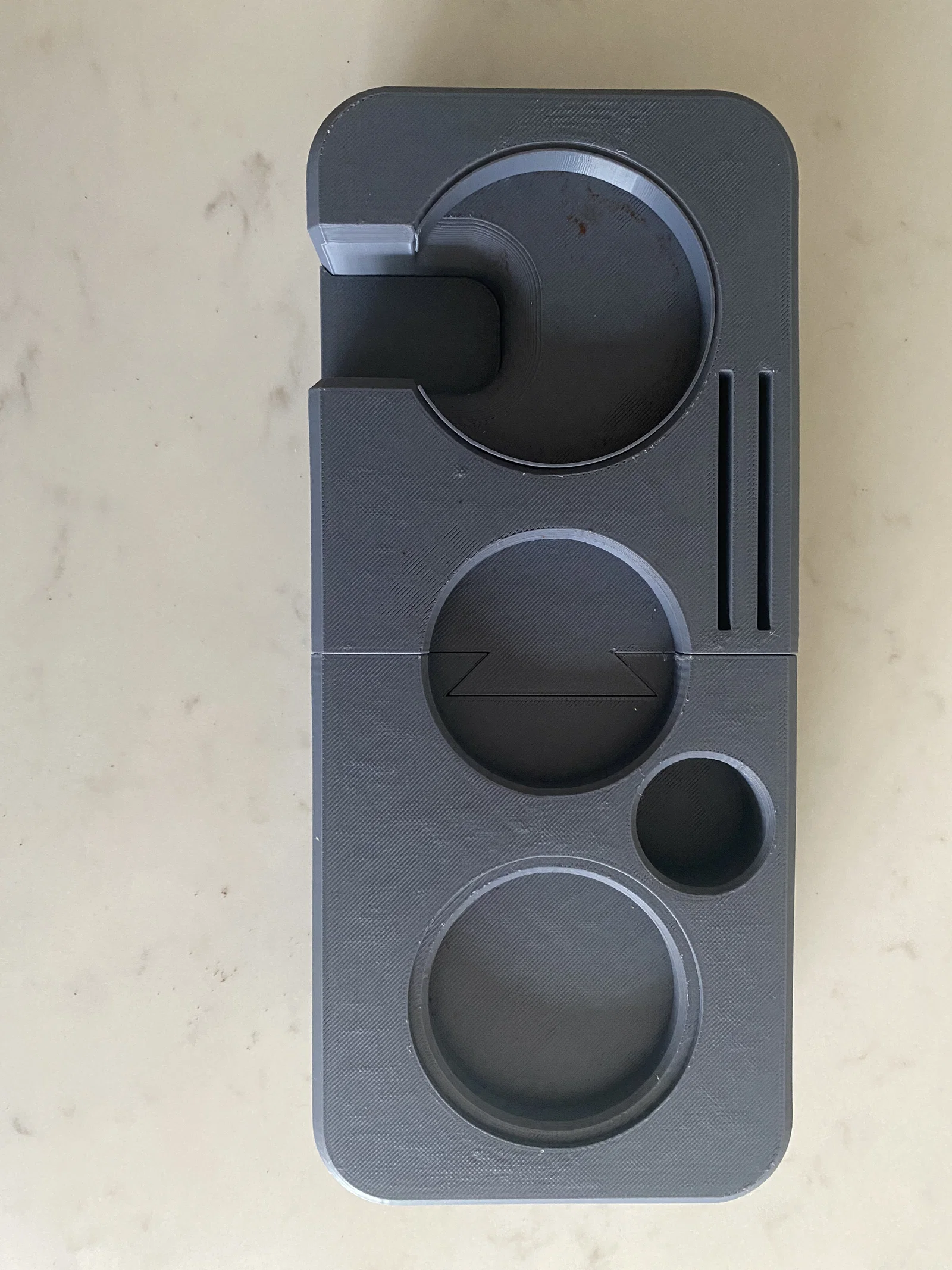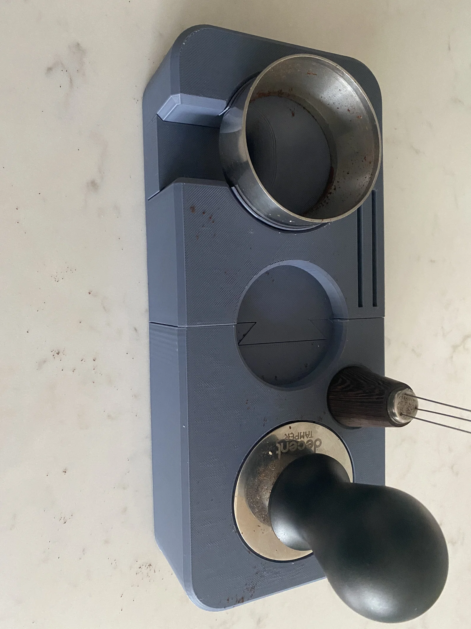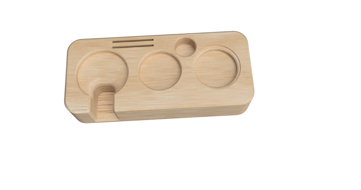 Trạm phụ kiện espresso dạng parametric, tuỳ biến theo tamper, distributer, funnel, WDT và 2 puck screens. Chỉ cần chỉnh parameters để khớp setup của bạn; có STL tham khảo cho cỡ 58.55mm.