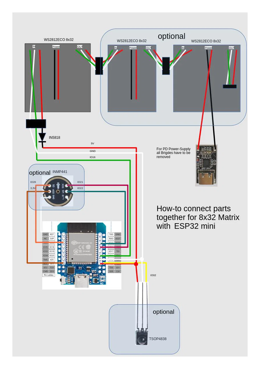 TSOP4838 được dùng làm bộ nhận remote. Nếu bạn nối nhiều hơn hai tấm 8x32 thì bạn phải giảm framerate trong WLED từ 42 xuống khoảng 23.
