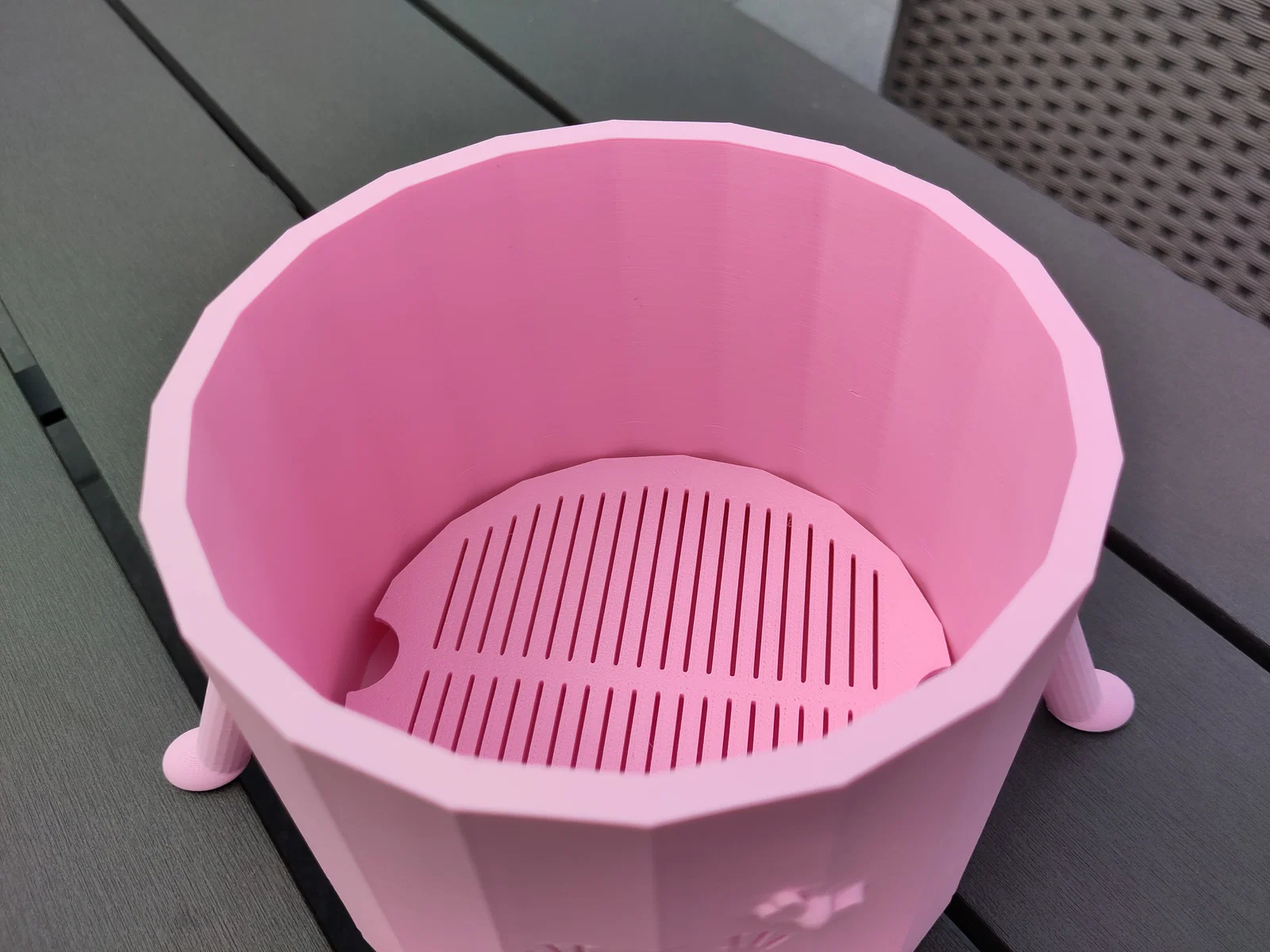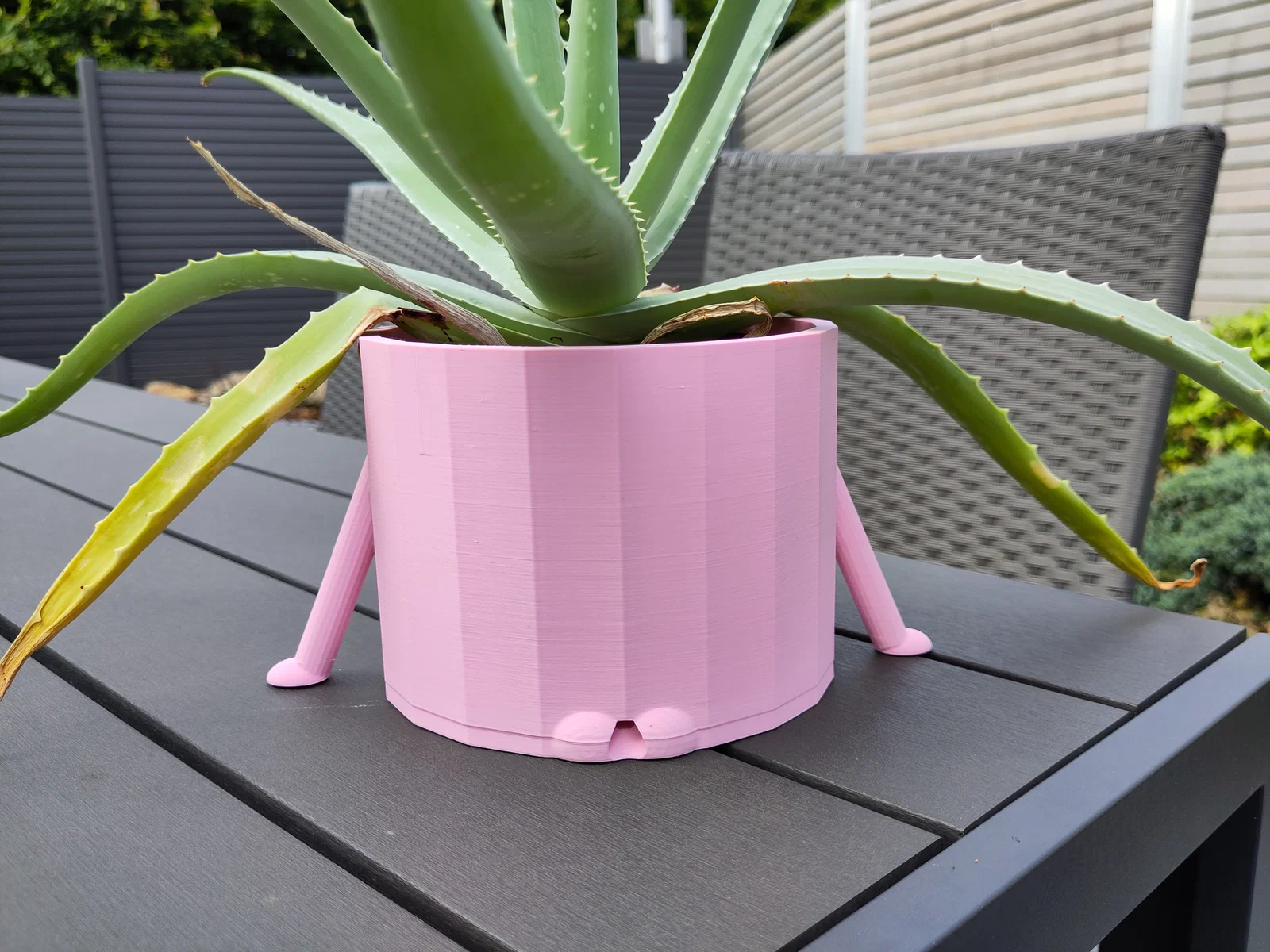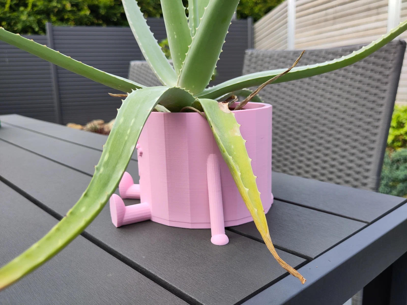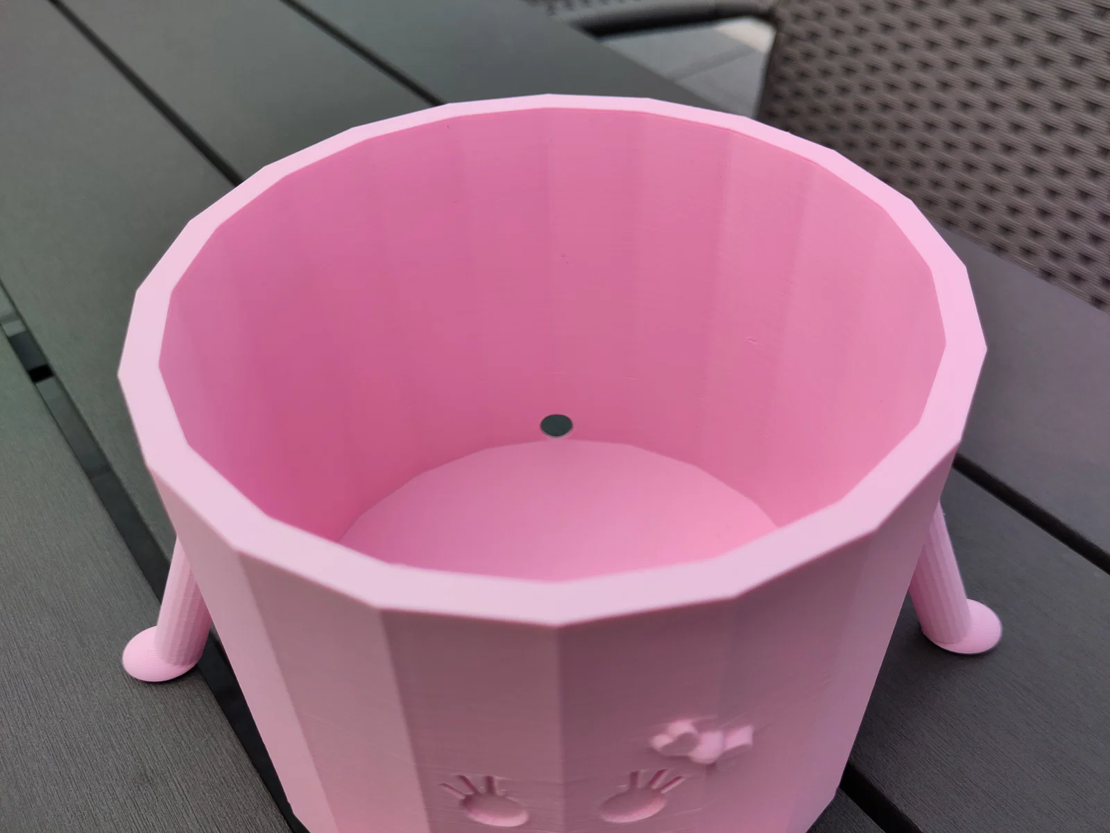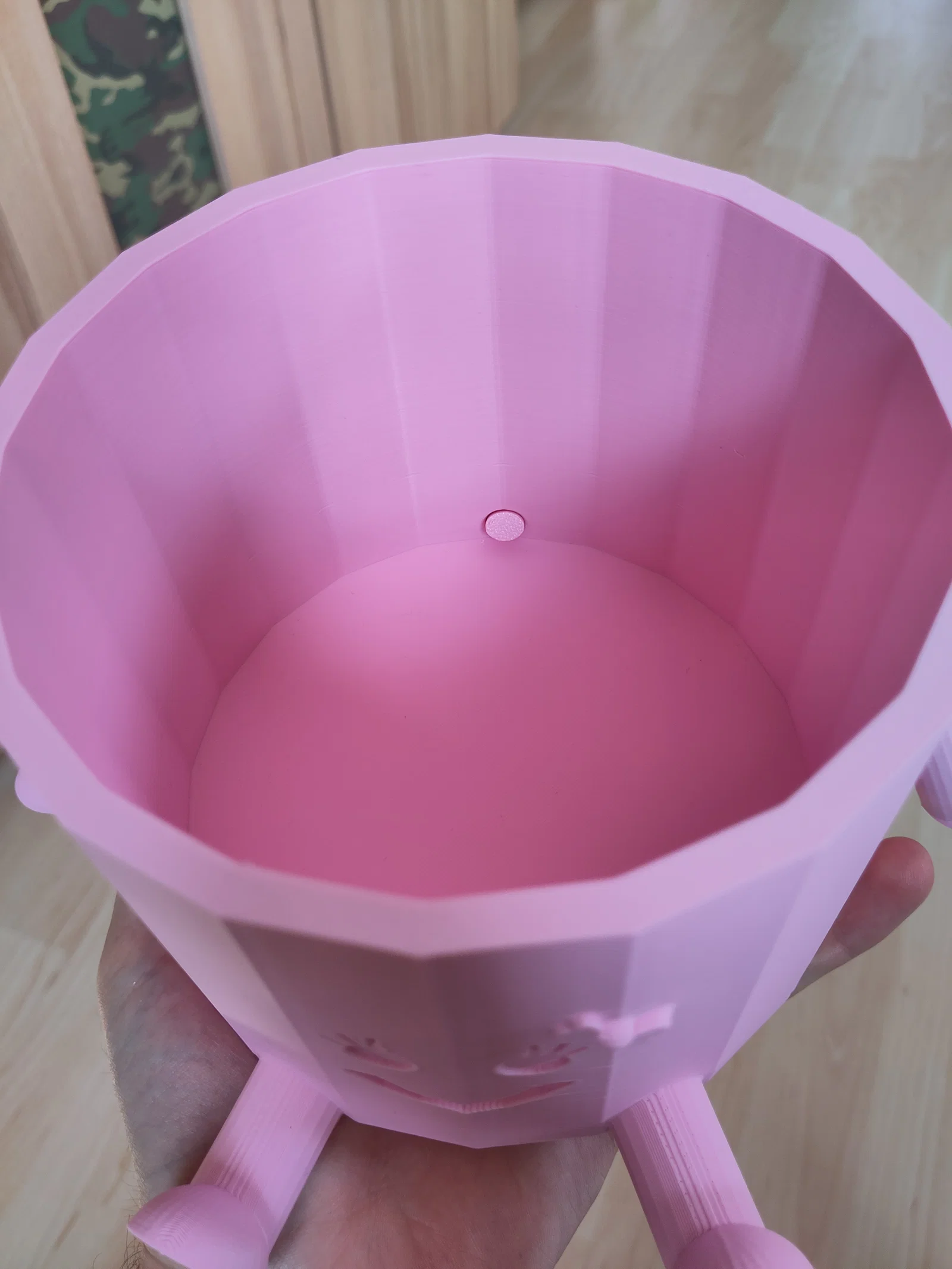 Chậu hoa có một gương mặt nhỏ xinh, ngồi “chill” trên kệ nhà ngắm cảnh, có tuỳ chọn lỗ thoát nước và phần kê nâng chậu. Lỗ thoát nước phía sau là tuỳ chọn, tuỳ theo phiên bản model. Nếu chọn có lỗ thoát, chậu sẽ hợp dùng ngoài trời hơn; còn không có lỗ thoát thì hợp dùng trong nhà. Nếu bạn in bản có lỗ thoát mà vẫn muốn dùng trong nhà, có thể đặt chậu lên một cái khay, hoặc tự bịt lỗ bằng dụng cụ của bạn, hoặc dùng nút bịt có sẵn trong file. Có 2 phiên bản nút bịt tuỳ theo dung sai (tolerance) của máy in: bản M khít vừa với lỗ thoát, bản S nhỏ hơn một chút.