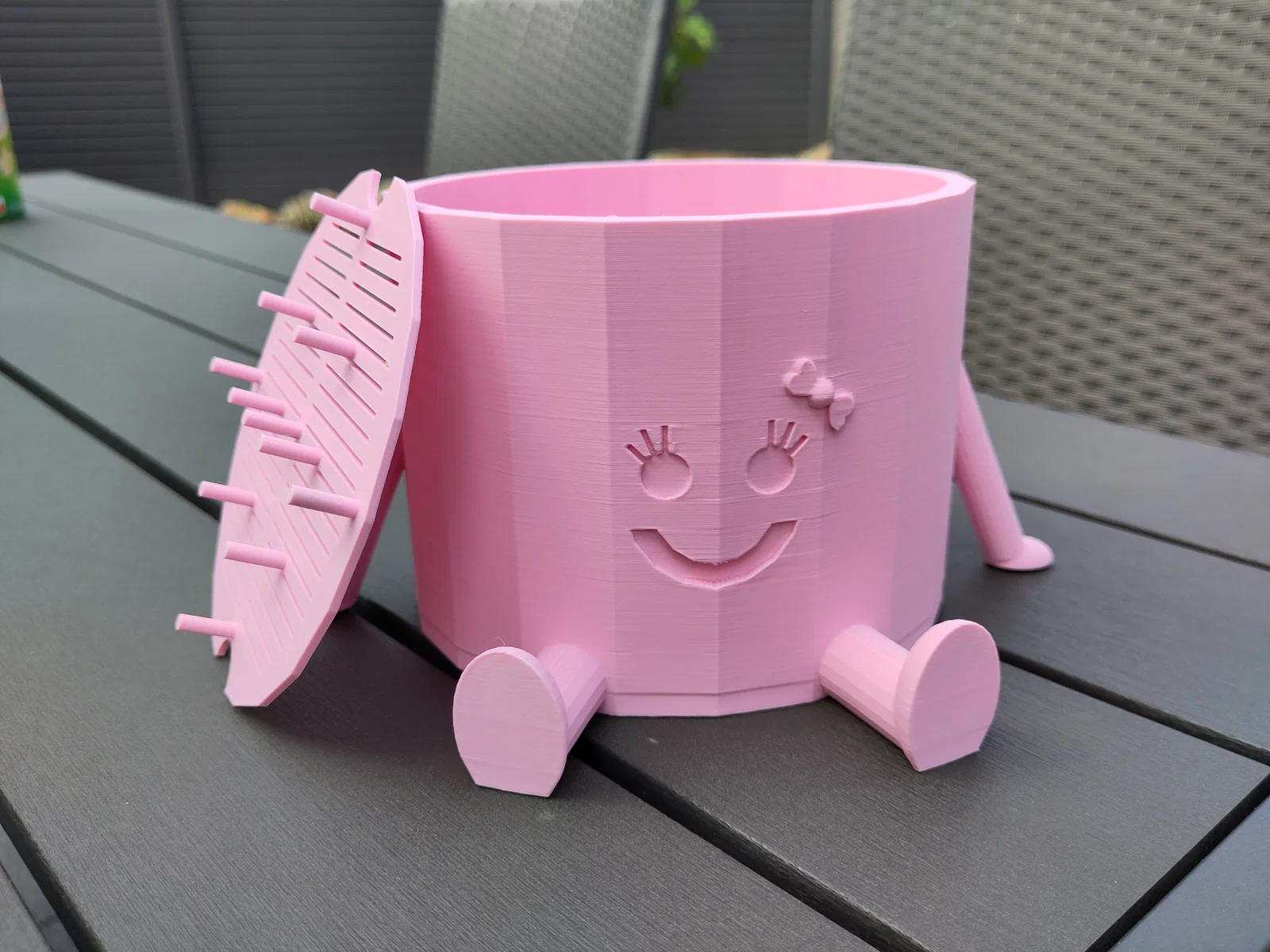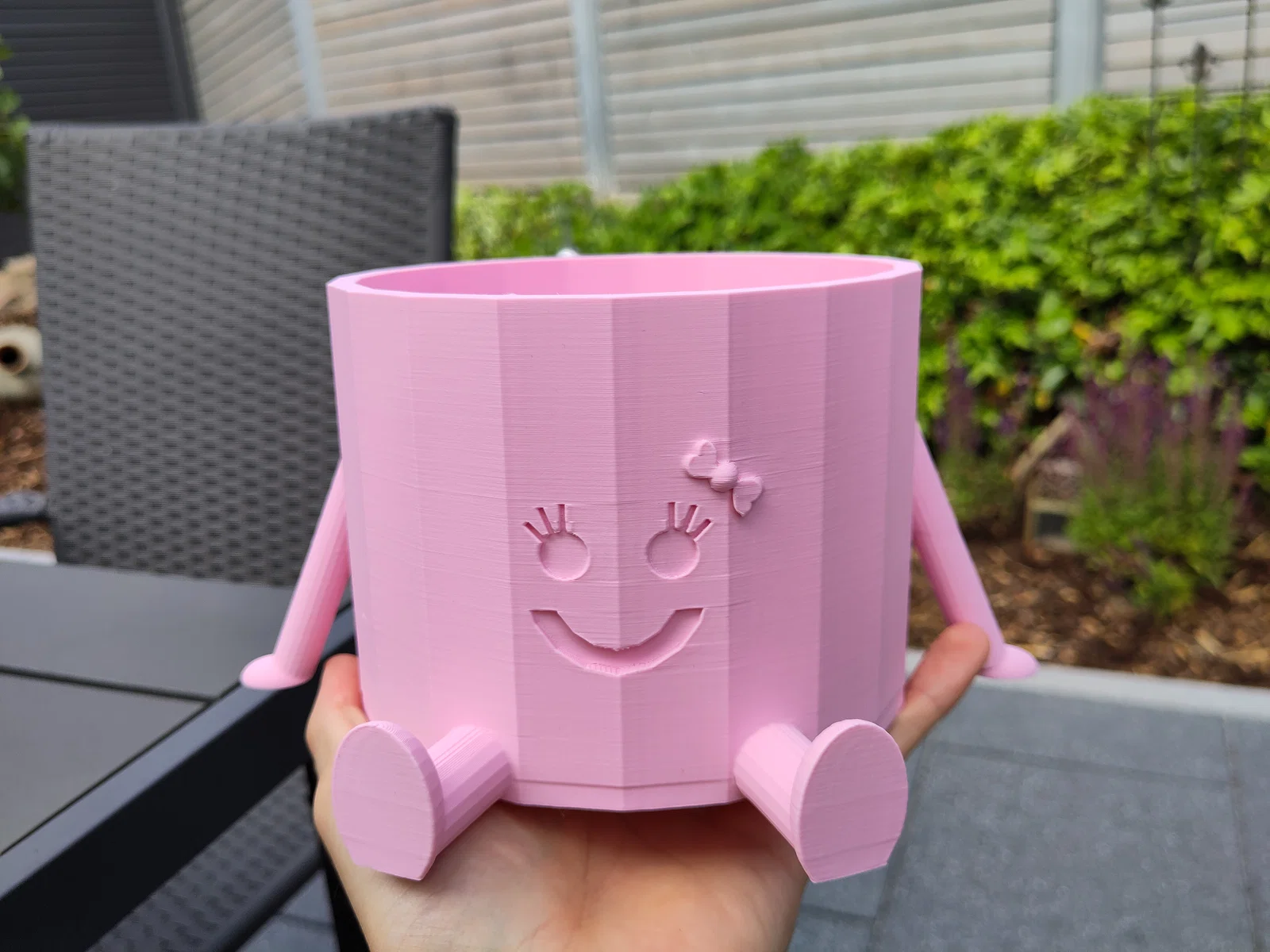 Chậu hoa “Cute Planter Girl” có gương mặt dễ thương, kèm tuỳ chọn lỗ thoát nước và phần kê nâng tạo ngăn chứa nước. Có nút bịt (2 size) theo tolerance, hỗ trợ làm chậu tự tưới. Khuyên dùng supports auto tree, wall 3.
