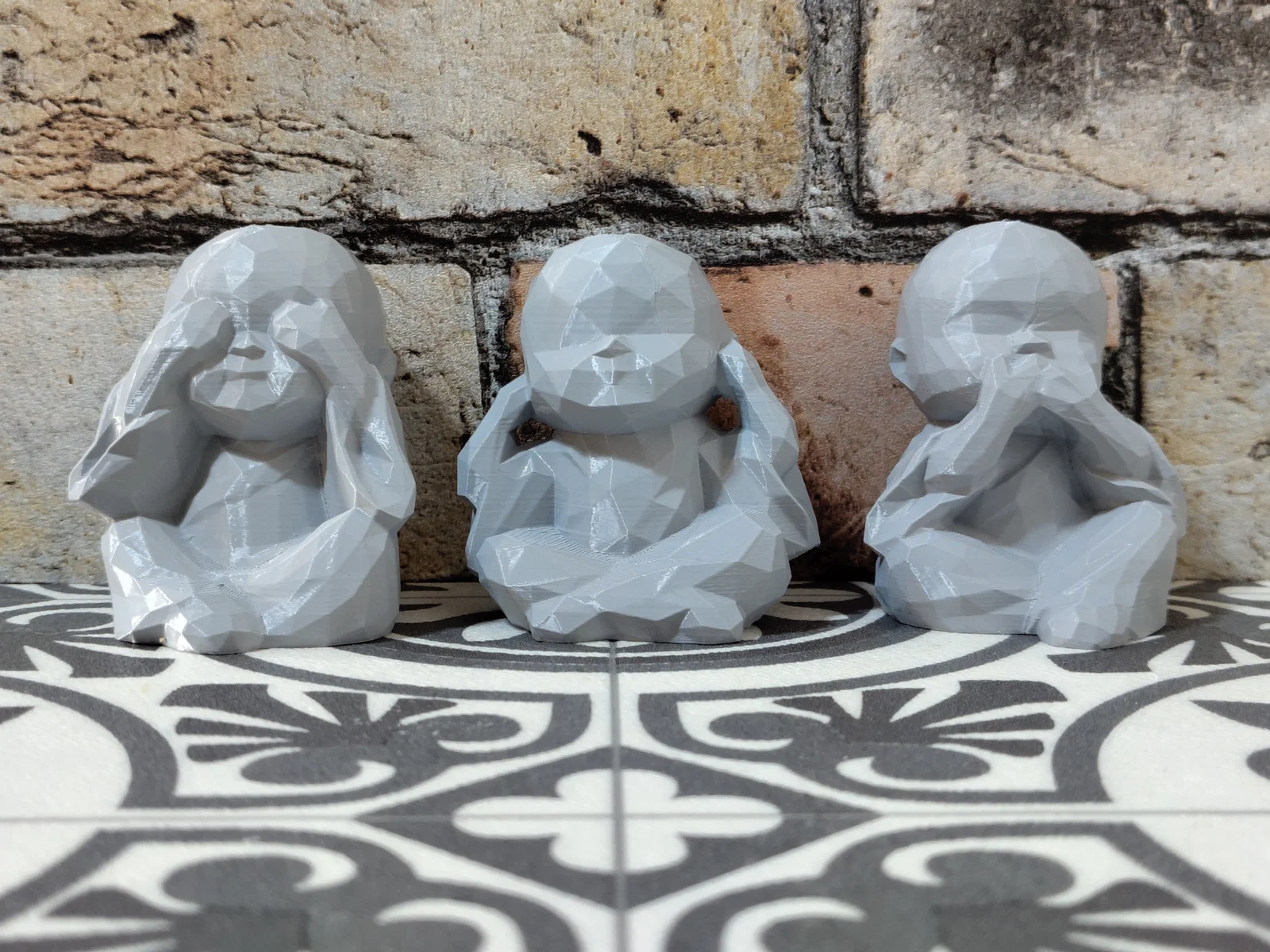Bộ 3 tượng Phật nhỏ dễ thương phong cách low poly. Đã cập nhật 2 file G-Code mới (seam ra mặt sau, thêm bản layer 0,1 mm). Toàn bộ STL đã được chỉnh đáy phẳng để in ổn định, không còn bị lún hay phải sửa.