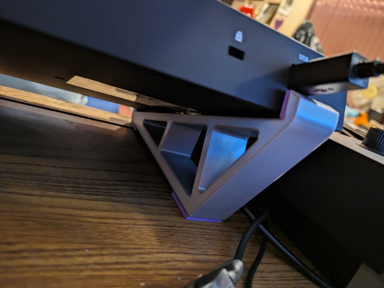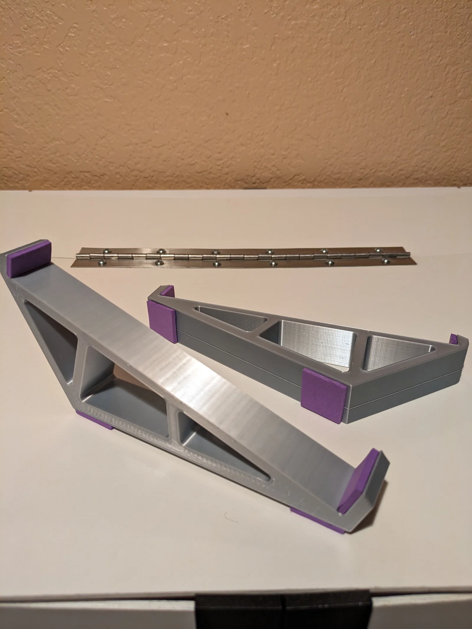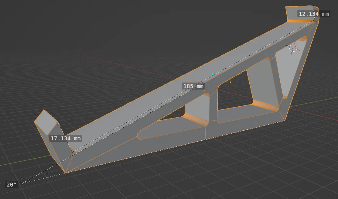 Mẫu được link (thiết kế cho bản mk1) là một khởi đầu rất ổn, nhưng có một điểm hơi khó chịu nên mình chỉnh lại thêm chút. Mình thay đổi nhẹ khoảng hở giữa hai gọng đỡ trước và sau để khớp với mk3 hơn, vẫn chừa chỗ cho 2 miếng đệm EVA foam 3mm ở mỗi đầu, cộng thêm vài mm để có độ “rơ” vừa đủ. Mình cũng hạ chiều cao của cả hai gọng, đặc biệt là gọng sau, để không che cổng USB khi đặt stand ngay dưới các chân cao su tích hợp sẵn của thiết bị. Mình cũng khuyên nên dán thêm vài miếng foam hoặc rubber ở mặt dưới stand để làm miếng chống trượt.