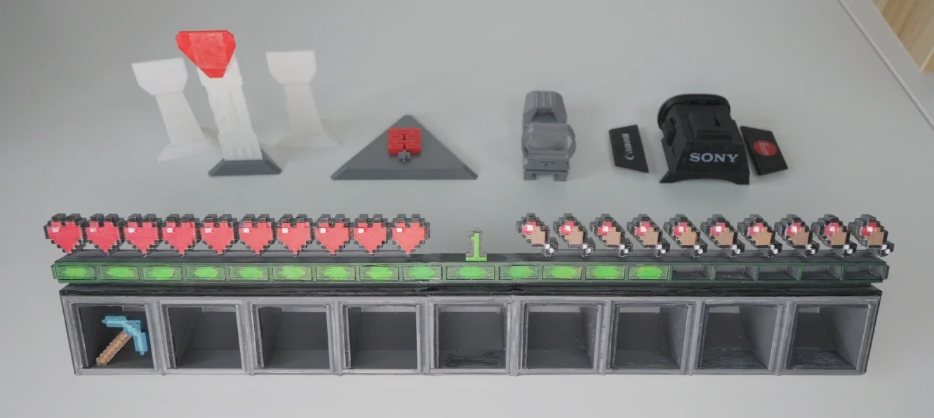 Bộ Minecraft Inventory gồm các mô-đun cất linh kiện nhỏ và Experience lắp ráp, tùy chọn Diamond Pickaxe/Experience Points/Level Number. In mặc định theo mẫu Taketake 256mm, có thể cắt và scale để in, kèm hướng dẫn màu và lắp ráp.