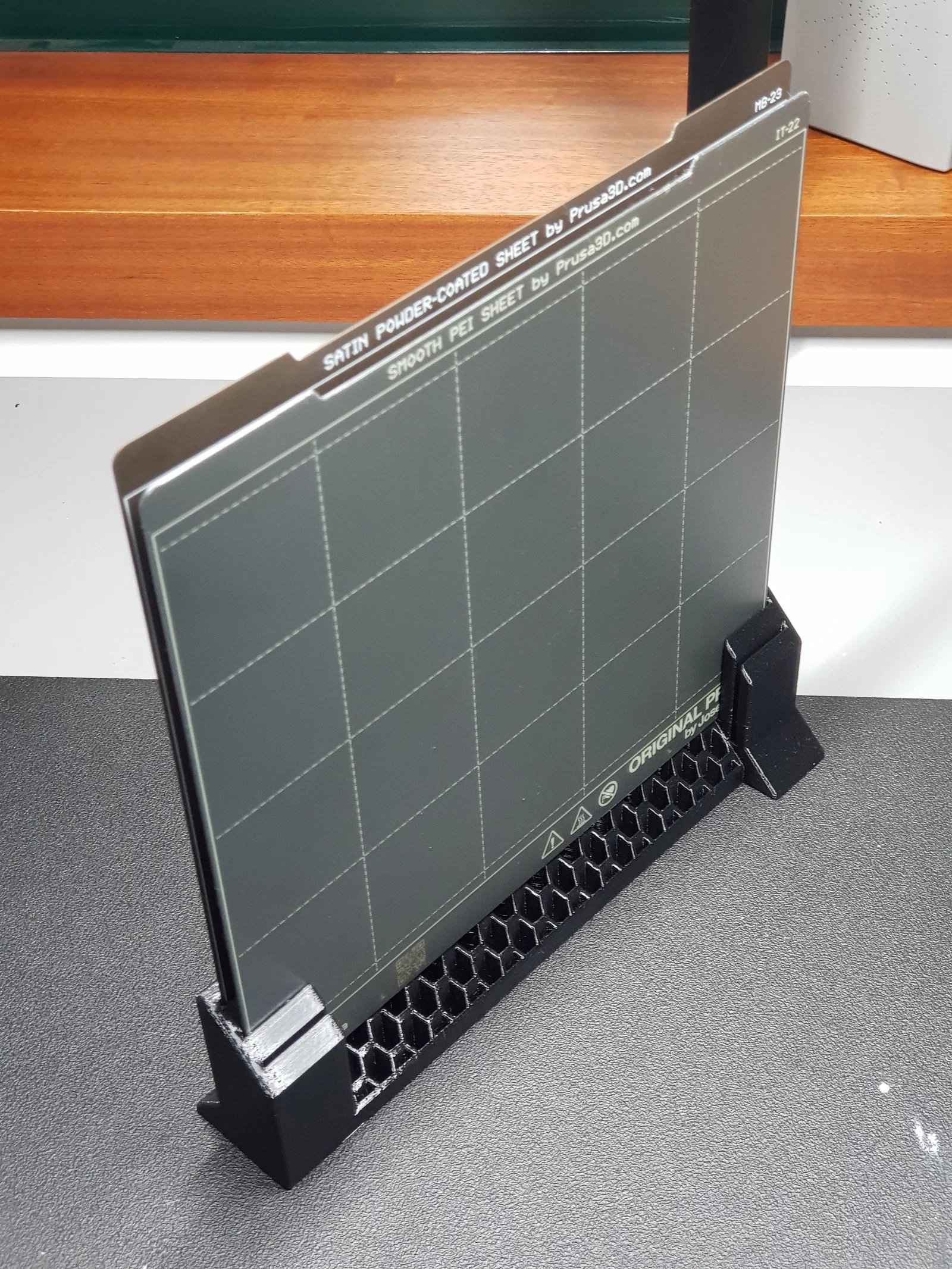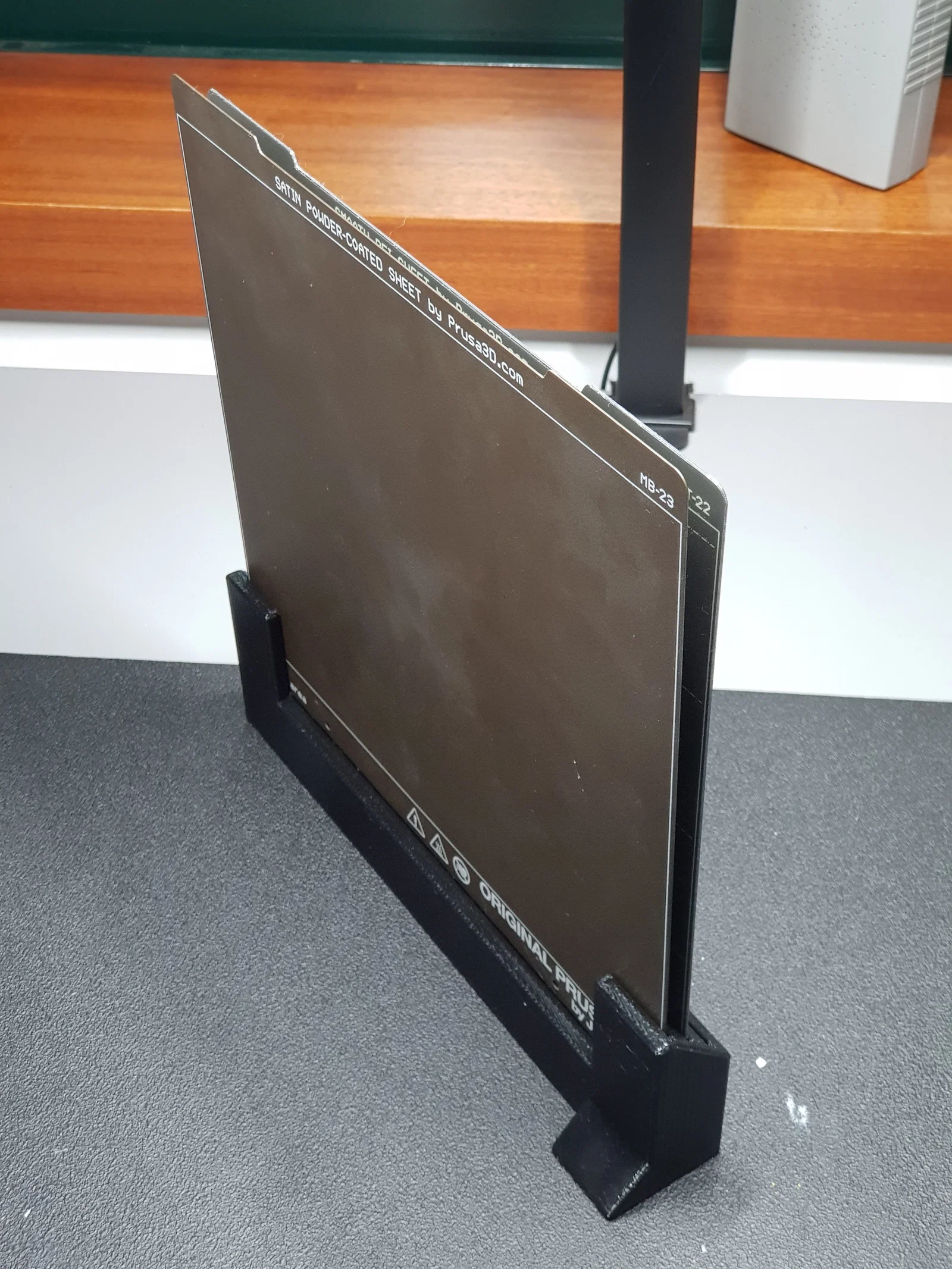 Bản remix của print sheet holder từ Waldmops, thiết kế dạng stand alone để đặt độc lập. Khuyến nghị in PETG (PLA cũng dùng ổn). Thiết lập gợi ý: infill 15%, layer height 0.2mm, không cần supports.