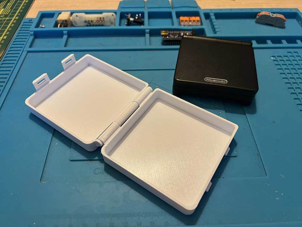 Hộp box case bản lề in 3D cho Game Boy Advance SP, thiết kế print-in-place vừa khít để bảo vệ máy an toàn. In kèm supports cho phần hinges là dùng được liền, không cần lắp ráp.