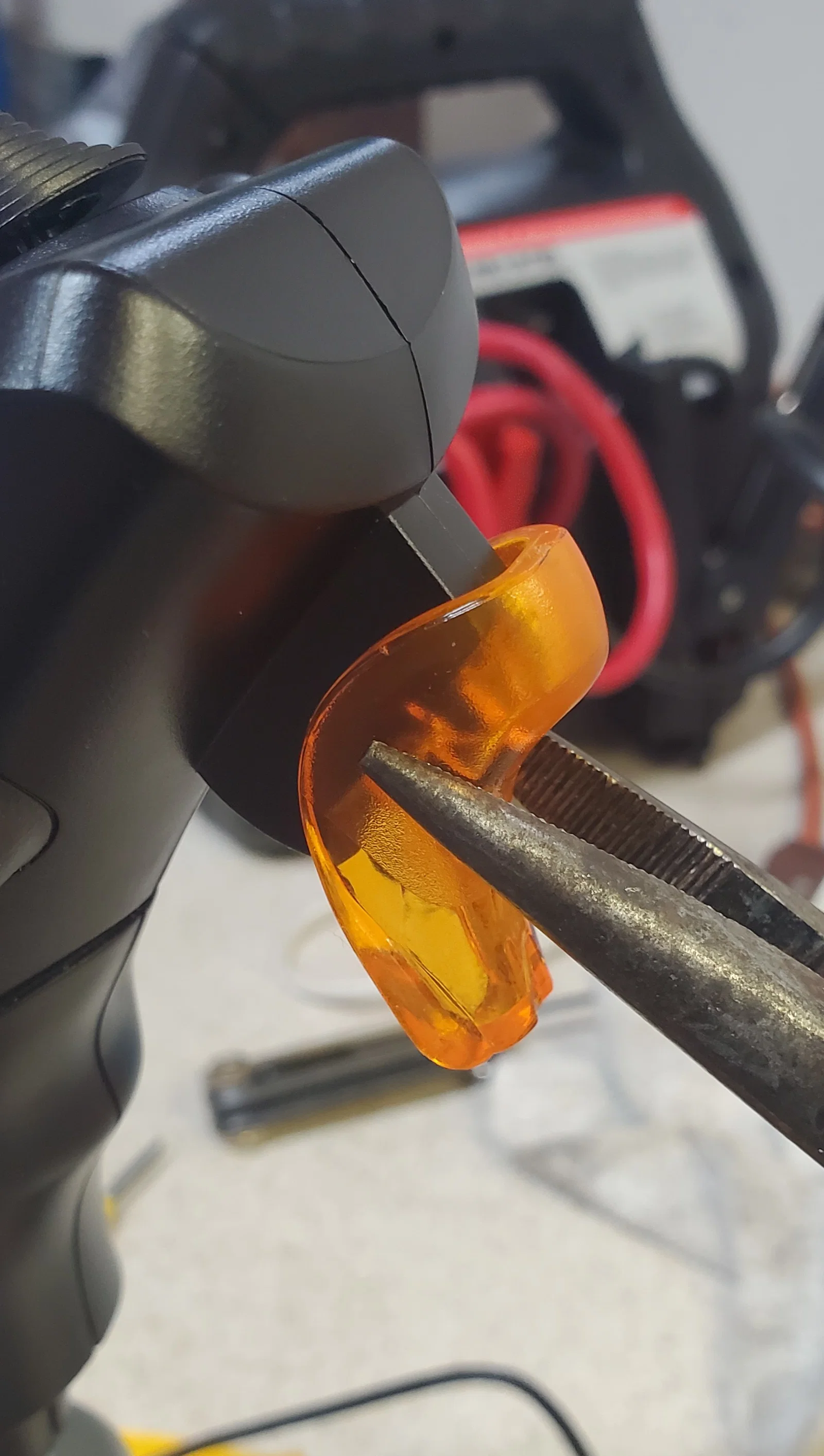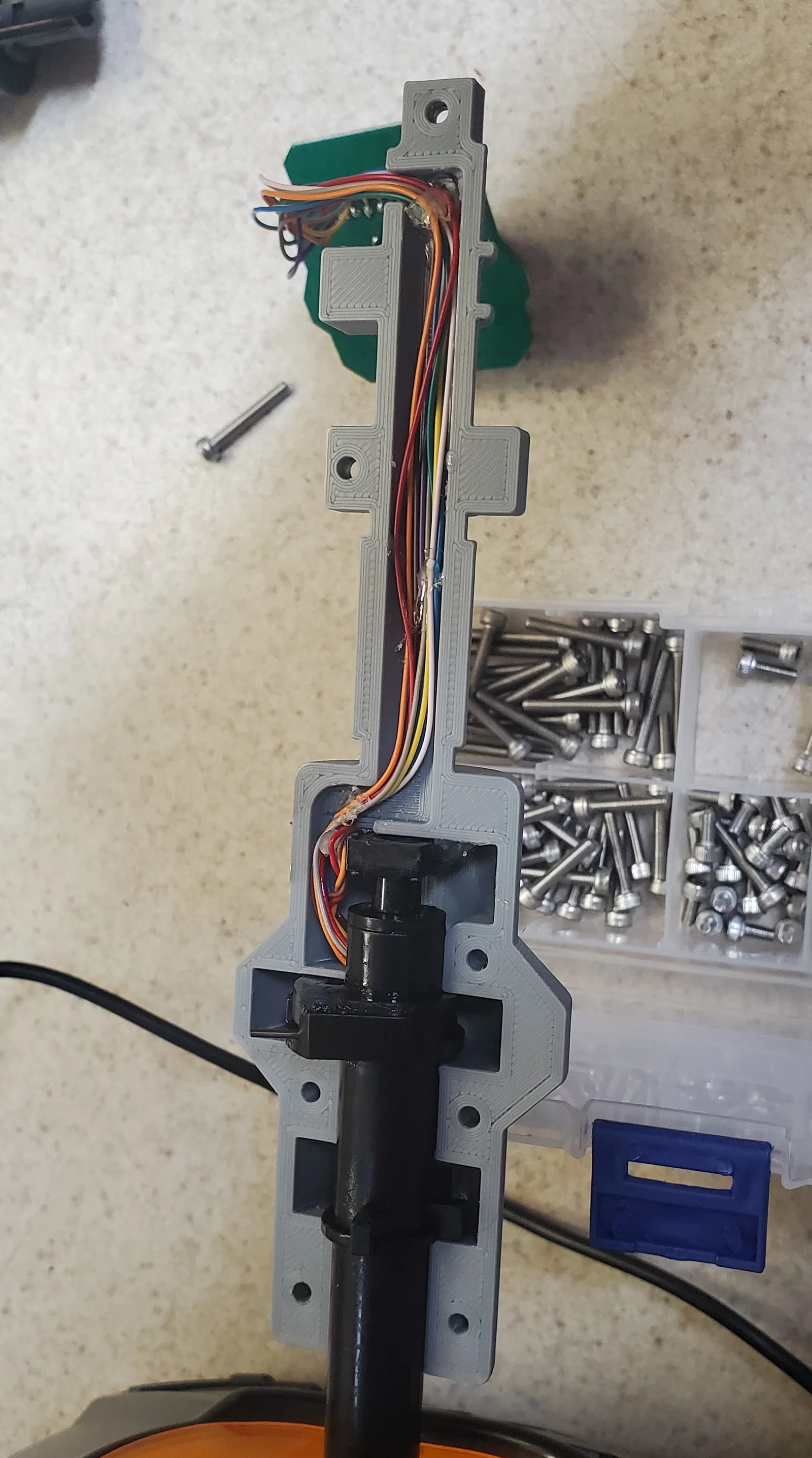 - Canh bản in khớp với cơ cấu twist và dùng một giọt keo nến để giữ potentiometer (pot) đúng vị trí. (Lúc này có cái khay hay cục kê sẽ tiện để tì bản in sát vào cần.)
